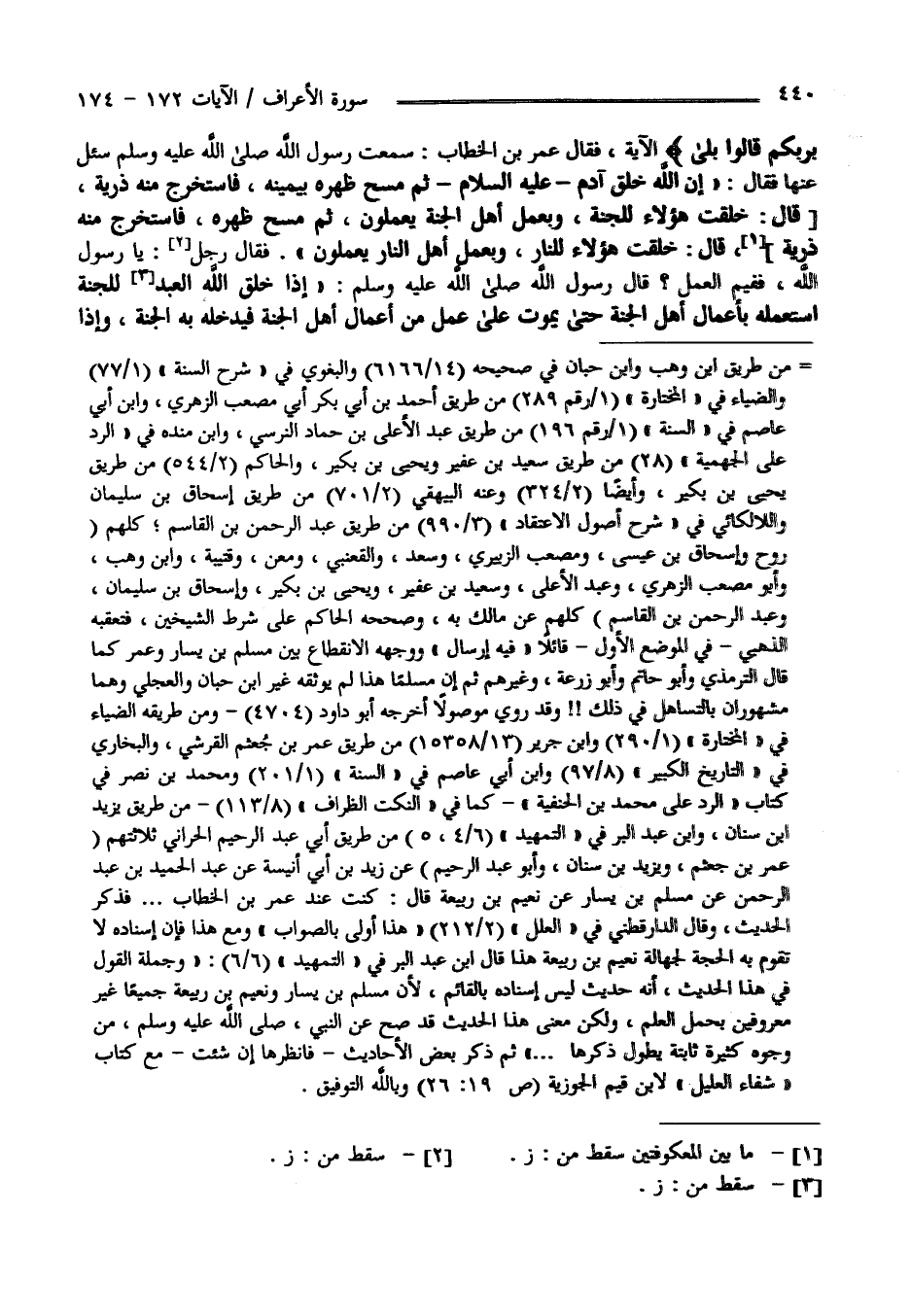 بِرَبِّكُمْ قَالُوا بَلَى " الْآيَة فَقَالَ عُمَر بْن الْخَطَّاب : سَمِعْت صَلَّى اللَّه عَلَيْهِ وَسَلَّمَ سُئِلَ عَنْهَا فَقَالَ " إِنَّ اللَّه خَلَقَ آدَم عَلَيْهِ السَّلَام ثُمَّ مَسَحَ ظَهْره بِيَمِينِهِ فَاسْتَخْرَجَ مِنْهُ ذُرِّيَّة قَالَ خَلَقْت هَؤُلَاءِ لِلْجَنَّةِ وَبِعَمَلِ أَهْل الْجَنَّة يَعْمَلُونَ ثُمَّ مَسَحَ ظَهْره فَاسْتَخْرَجَ مِنْهُ ذُرِّيَّة قَالَ خَلَقْت هَؤُلَاءِ لِلنَّارِ وَبِعَمَلِ أَهْل النَّار يَعْمَلُونَ " فَقَالَ رَجُل يَا رَسُول اللَّه فَفِيمَ الْعَمَل قَالَ رَسُول اللَّه صَلَّى اللَّه عَلَيْهِ وَسَلَّمَ " إِذَا خَلَقَ اللَّه الْعَبْد لِلْجَنَّةِ اِسْتَعْمَلَهُ بِأَعْمَالِ أَهْل الْجَنَّة حَتَّى يَمُوت عَلَى عَمَل مِنْ أَعْمَال أَهْل الْجَنَّة فَيُدْخِلهُ بِهِ الْجَنَّة وَإِذَا