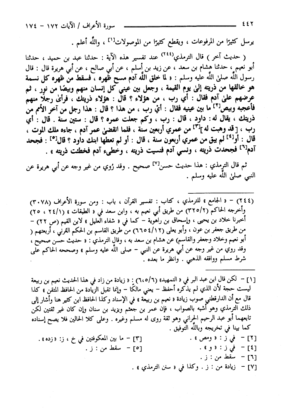 يُرْسِل كَثِيرًا مِنْ الْمَرْفُوعَات وَيَقْطَع كَثِيرًا مِنْ الْمَوْصُولَات وَاَللَّه أَعْلَم . " حَدِيث آخَر " قَالَ التِّرْمِذِيّ عِنْد تَفْسِيره هَذِهِ الْآيَة : حَدَّثَنَا عَبْد بْن حُمَيْد حَدَّثَنَا أَبُو نُعَيْم حَدَّثَنَا هِشَام بْن سَعْد عَنْ زَيْد بْن أَسْلَمَ عَنْ أَبِي صَالِح عَنْ أَبِي هُرَيْرَة قَالَ : قَالَ رَسُول اللَّه صَلَّى اللَّه عَلَيْهِ وَسَلَّمَ " لَمَّا خَلَقَ اللَّه آدَم مَسَحَ ظَهْره فَسَقَطَ مِنْ ظَهْره كُلّ نَسَمَة هُوَ خَالِقهَا مِنْ ذُرِّيَّته إِلَى يَوْم الْقِيَامَة وَجَعَلَ بَيْن عَيْنَيْ كُلّ إِنْسَان مِنْهُمْ وَبِيصًا مِنْ نُور ثُمَّ عَرَضَهُمْ عَلَى آدَم فَقَالَ أَيْ رَبّ مَنْ هَؤُلَاءِ قَالَ هَؤُلَاءِ ذُرِّيَّتك فَرَأَى رَجُلًا مِنْهُمْ فَأَعْجَبَهُ وَبِيص مَا بَيْن عَيْنَيْهِ قَالَ أَيْ رَبّ مَنْ هَذَا ؟ قَالَ هَذَا رَجُل مِنْ آخِر الْأُمَم مِنْ ذُرِّيَّتك يُقَال لَهُ دَاوُدُ قَالَ رَبّ وَكَمْ جَعَلْت عُمْره قَالَ سِتِّينَ سَنَة قَالَ أَيْ رَبّ قَدْ وَهَبْت لَهُ مِنْ عُمْرِي أَرْبَعِينَ سَنَة فَلَمَّا اِنْقَضَى عُمْر آدَم جَاءَهُ مَلَك الْمَوْت قَالَ : أَوَلَمْ يَبْقَ مِنْ عُمْرِي أَرْبَعُونَ سَنَة ؟ قَالَ : أَوَلَمْ تُعْطِهَا اِبْنك دَاوُدَ قَالَ فَجَحَدَ آدَم فَجَحَدَتْ ذُرِّيَّته وَنَسِيَ آدَم فَنَسِيَتْ ذُرِّيَّته وَخَطِئَ آدَم فَخَطِئَتْ ذُرِّيَّته " ثُمَّ قَالَ التِّرْمِذِيّ : هَذَا حَدِيث حَسَن صَحِيح وَقَدْ رُوِيَ مِنْ غَيْر وَجْه عَنْ أَبِي هُرَيْرَة عَنْ النَّبِيّ صَلَّى اللَّه عَلَيْهِ وَسَلَّمَ