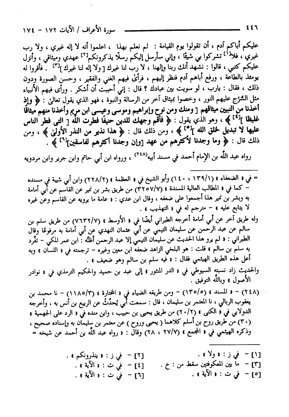 عَلَيْكُمْ أَبَاكُمْ آدَم أَنْ تَقُولُوا يَوْم الْقِيَامَة لَمْ نَعْلَم بِهَذَا اِعْلَمُوا أَنَّهُ لَا إِلَه غَيْرِي وَلَا رَبّ غَيْرِي وَلَا تُشْرِكُوا بِي شَيْئًا وَإِنِّي سَأُرْسِلُ إِلَيْكُمْ رُسُلًا لِيُنْذِرُوكُمْ عَهْدِي وَمِيثَاقِي وَأُنْزِل عَلَيْكُمْ كُتُبِي قَالُوا نَشْهَد أَنَّك رَبّنَا وَإِلَهنَا لَا رَبّ لَنَا غَيْرك وَلَا إِلَه لَنَا غَيْرك فَأَقَرُّوا لَهُ يَوْمئِذٍ بِالطَّاعَةِ وَرَفَعَ أَبَاهُمْ آدَم فَنَظَرَ إِلَيْهِمْ فَرَأَى فِيهِمْ الْغَنِيّ وَالْفَقِير وَحَسَن الصُّورَة وَدُون ذَلِكَ فَقَالَ : يَا رَبّ لَوْ سَوَّيْت بَيْن عِبَادك ؟ قَالَ إِنِّي أَحْبَبْت أَنْ أُشْكَر وَرَأَى فِيهِمْ الْأَنْبِيَاء مِثْل السُّرُج عَلَيْهِمْ النُّور وَخُصُّوا بِمِيثَاقٍ آخَر مِنْ الرِّسَالَة وَالنُّبُوَّة فَهُوَ الَّذِي يَقُول تَعَالَى " وَإِذْ أَخَذْنَا مِنْ النَّبِيِّينَ مِيثَاقهمْ " الْآيَة وَهُوَ الَّذِي يَقُول " فَأَقِمْ وَجْهك لِلدِّينِ حَنِيفًا فِطْرَة اللَّه " الْآيَة وَمِنْ ذَلِكَ قَالَ " هَذَا نَذِير مِنْ النُّذُر الْأُولَى " وَمِنْ ذَلِكَ قَالَ " وَمَا وَجَدْنَا لِأَكْثَرِهِمْ مِنْ عَهْد " الْآيَة رَوَاهُ عَبْد اللَّه بْن الْإِمَام أَحْمَد فِي مُسْنَد أَبِيهِ وَرَوَاهُ اِبْن أَبِي حَاتِم وَابْن جَرِير وَابْن مَرْدَوَيْهِ