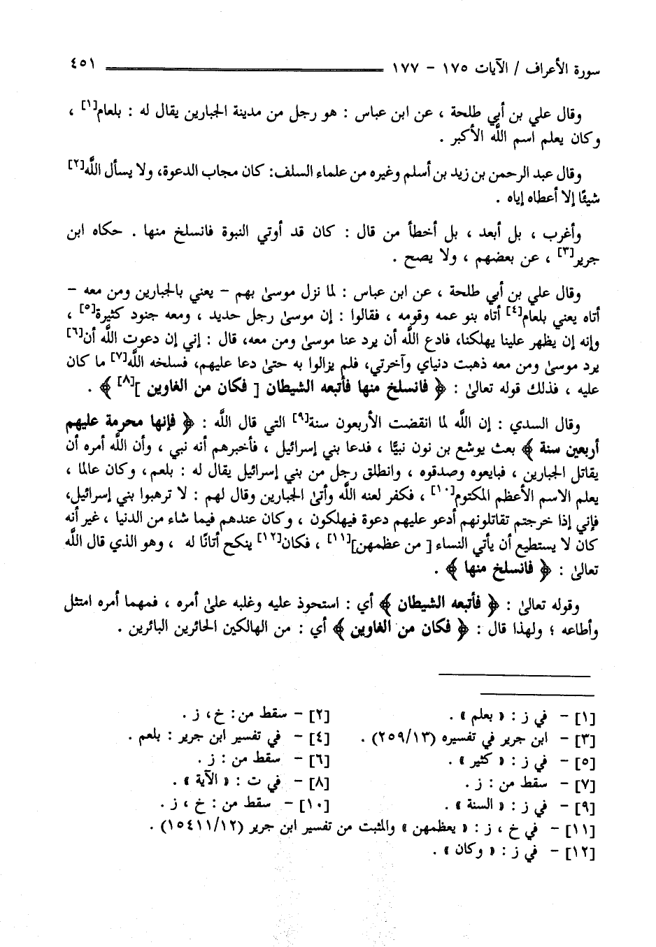 وَقَالَ عَلِيّ بْن أَبِي طَلْحَة عَنْ اِبْن عَبَّاس هُوَ رَجُل مِنْ مَدِينَة الْجَبَّارِينَ يُقَال لَهُ بَلْعَام وَكَانَ يَعْلَم اِسْم اللَّه الْأَكْبَر وَقَالَ عَبْد الرَّحْمَن بْن زَيْد بْن أَسْلَمَ وَغَيْره مِنْ عُلَمَاء السَّلَف كَانَ مُجَاب الدَّعْوَة وَلَا يَسْأَل اللَّه شَيْئًا إِلَّا أَعْطَاهُ إِيَّاهُ وَأَغْرَبَ بَلْ أَبْعَدَ بَلْ أَخْطَأَ مَنْ قَالَ كَانَ قَدْ أُوتِيَ النُّبُوَّة فَانْسَلَخَ مِنْهَا حَكَاهُ اِبْن جَرِير عَنْ بَعْضهمْ وَلَا يَصِحّ وَقَالَ عَلِيّ بْن أَبِي طَلْحَة عَنْ اِبْن عَبَّاس لَمَّا نَزَلَ مُوسَى بِهِمْ يَعْنِي بِالْجَبَّارِينَ وَمَنْ مَعَهُ أَتَاهُ - يَعْنِي بُلْعُم - بَنُو عَمّه وَقَوْمه فَقَالُوا إِنَّ مُوسَى رَجُل حَدِيد وَمَعَهُ جُنُود كَثِيرَة وَإِنَّهُ إِنْ يَظْهَر عَلَيْنَا يُهْلِكنَا فَادْعُ اللَّه أَنْ يَرُدّ عَنَّا مُوسَى وَمَنْ مَعَهُ قَالَ إِنِّي إِنْ دَعَوْت اللَّه أَنْ يَرُدّ مُوسَى وَمَنْ مَعَهُ ذَهَبَتْ دُنْيَايَ وَآخِرَتِي فَلَمْ يَزَالُوا بِهِ حَتَّى دَعَا عَلَيْهِمْ فَسَلَخَهُ اللَّه مَا كَانَ عَلَيْهِ فَذَلِكَ قَوْله تَعَالَى " فَانْسَلَخَ مِنْهَا فَأَتْبَعَهُ الشَّيْطَان " الْآيَة وَقَالَ السُّدِّيّ لَمَّا اِنْقَضَتْ الْأَرْبَعُونَ سَنَة الَّتِي قَالَ اللَّه " فَإِنَّهَا مُحَرَّمَة عَلَيْهِمْ أَرْبَعِينَ سَنَة " بَعَثَ يُوشَع بْن نُون نَبِيًّا فَدَعَا بَنِي إِسْرَائِيل فَأَخْبَرَهُمْ أَنَّهُ نَبِيّ وَأَنَّ اللَّه أَمَرَهُ أَنْ يُقَاتِل الْجَبَّارِينَ فَبَايَعُوهُ وَصَدَّقُوهُ وَانْطَلَقَ رَجُل مِنْ بَنِي إِسْرَائِيل يُقَال لَهُ بَلْعَام فَكَانَ عَالِمًا يَعْلَم الِاسْم الْأَعْظَم الْمَكْتُوم فَكَفَرَ - لَعَنَهُ اللَّه - وَأَتَى الْجَبَّارِينَ وَقَالَ لَهُمْ لَا تُرْهِبُوا بَنِي إِسْرَائِيل فَإِنِّي إِذَا خَرَجْتُمْ تُقَاتِلُونَهُمْ اُدْعُوا عَلَيْهِمْ دَعْوَة فَيَهْلِكُونَ وَكَانَ عِنْدهمْ فِيمَا شَاءَ مِنْ الدُّنْيَا غَيْر أَنَّهُ كَانَ لَا يَسْتَطِيع أَنْ يَأْتِي النِّسَاء