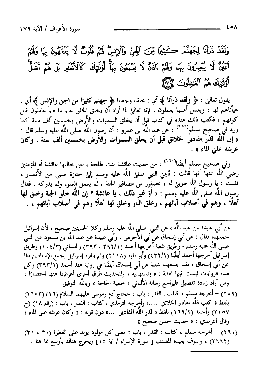 يَقُول تَعَالَى " وَلَقَدْ ذَرَأْنَا لِجَهَنَّم " أَيْ خَلَقْنَا وَجَعَلْنَا لِجَهَنَّم " كَثِيرًا مِنْ الْجِنّ وَالْإِنْس " أَيْ هَيَّأْنَاهُمْ لَهَا وَبِعَمَلِ أَهْلهَا يَعْمَلُونَ فَإِنَّهُ تَعَالَى لَمَّا أَرَادَ أَنْ يَخْلُق الْخَلْق عَلِمَ مَا هُمْ عَامِلُونَ قَبْل كَوْنهمْ فَكَتَبَ ذَلِكَ عِنْده فِي كِتَاب قَبْل أَنْ يَخْلُق السَّمَاوَات وَالْأَرْض بِخَمْسِينَ أَلْف سَنَة كَمَا وَرَدَ فِي صَحِيح مُسْلِم عَنْ عَبْد اللَّه بْن عَمْرو أَنَّ رَسُول اللَّه صَلَّى اللَّه عَلَيْهِ وَسَلَّمَ قَالَ " إِنَّ اللَّه قَدَّرَ مَقَادِير الْخَلْق قَبْل أَنْ يَخْلُق السَّمَاوَات وَالْأَرْض بِخَمْسِينَ أَلْف سَنَة وَكَانَ عَرْشه عَلَى الْمَاء ".