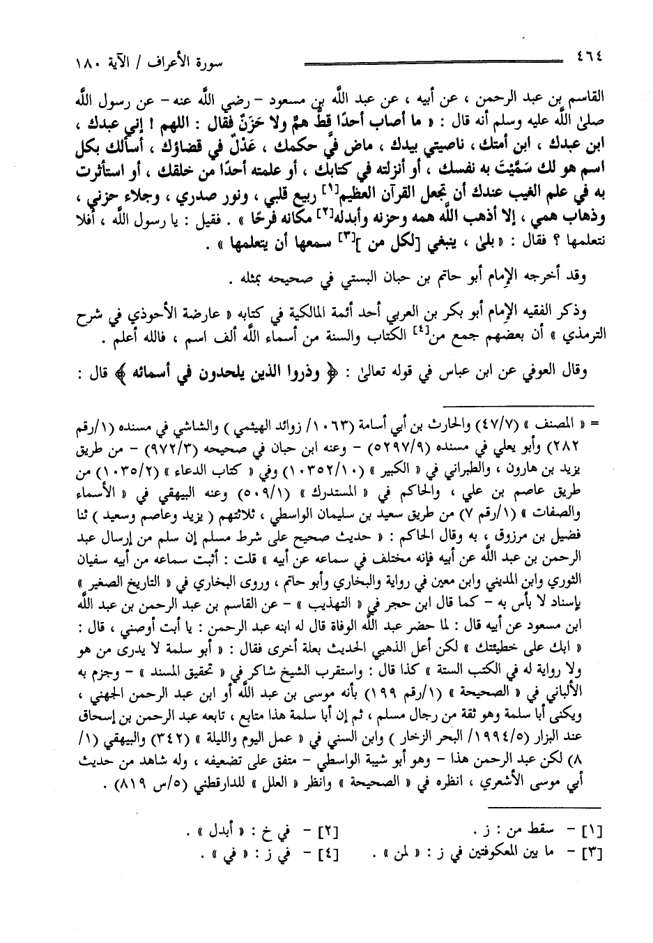 عَلَيْهِ وَسَلَّمَ أَنَّهُ قَالَ " مَا أَصَابَ أَحَدًا قَطُّ هَمّ وَلَا حَزَن فَقَالَ اللَّهُمَّ إِنِّي عَبْدك اِبْن عَبْدك اِبْن أَمَتك نَاصِيَتِي بِيَدِك مَاضٍ فِيَّ حُكْمك عَدْل فِيَّ قَضَاؤُك أَسْأَلك بِكُلِّ اِسْم هُوَ لَك سَمَّيْت بِهِ نَفْسك أَوْ أَنْزَلْته فِي كِتَابك أَوْ عَلَّمْته أَحَدًا مِنْ خَلْقك أَوْ اِسْتَأْثَرْت بِهِ فِي عِلْم الْغَيْب عِنْدك أَنْ تَجْعَل الْقُرْآن الْعَظِيم رَبِيع قَلْبِي وَنُور صَدْرِي وَجَلَاء حُزْنِي وَذَهَاب هَمِّي إِلَّا أَذْهَبَ اللَّه حُزْنه وَهَمَّهُ وَأَبْدَلَ مَكَانه فَرَحًا " فَقِيلَ يَا رَسُول اللَّه أَفَلَا نَتَعَلَّمهَا ؟ فَقَالَ " بَلَى يَنْبَغِي لِكُلِّ مَنْ سَمِعَهَا أَنْ يَتَعَلَّمهَا" وَقَدْ أَخْرَجَهُ الْإِمَام أَبُو حَاتِم بْن حِبَّان الْبُسْتِيّ فِي صَحِيحه بِمِثْلِهِ وَذَكَرَ الْفَقِيه الْإِمَام أَبُو بَكْر بْن الْعَرَبِيّ أَحَد أَئِمَّة الْمَالِكِيَّة فِي كِتَابه الْأَحْوَذِيّ فِي شَرْح التِّرْمِذِيّ أَنَّ بَعْضهمْ جَمَعَ مِنْ الْكِتَاب وَالسُّنَّة مِنْ أَسْمَاء اللَّه أَلْف اِسْم فَاَللَّه أَعْلَم وَقَالَ الْعَوْفِيّ عَنْ اِبْن عَبَّاس فِي قَوْله تَعَالَى " وَذَرُوا الَّذِينَ يُلْحِدُونَ فِي أَسْمَائِهِ " قَالَ