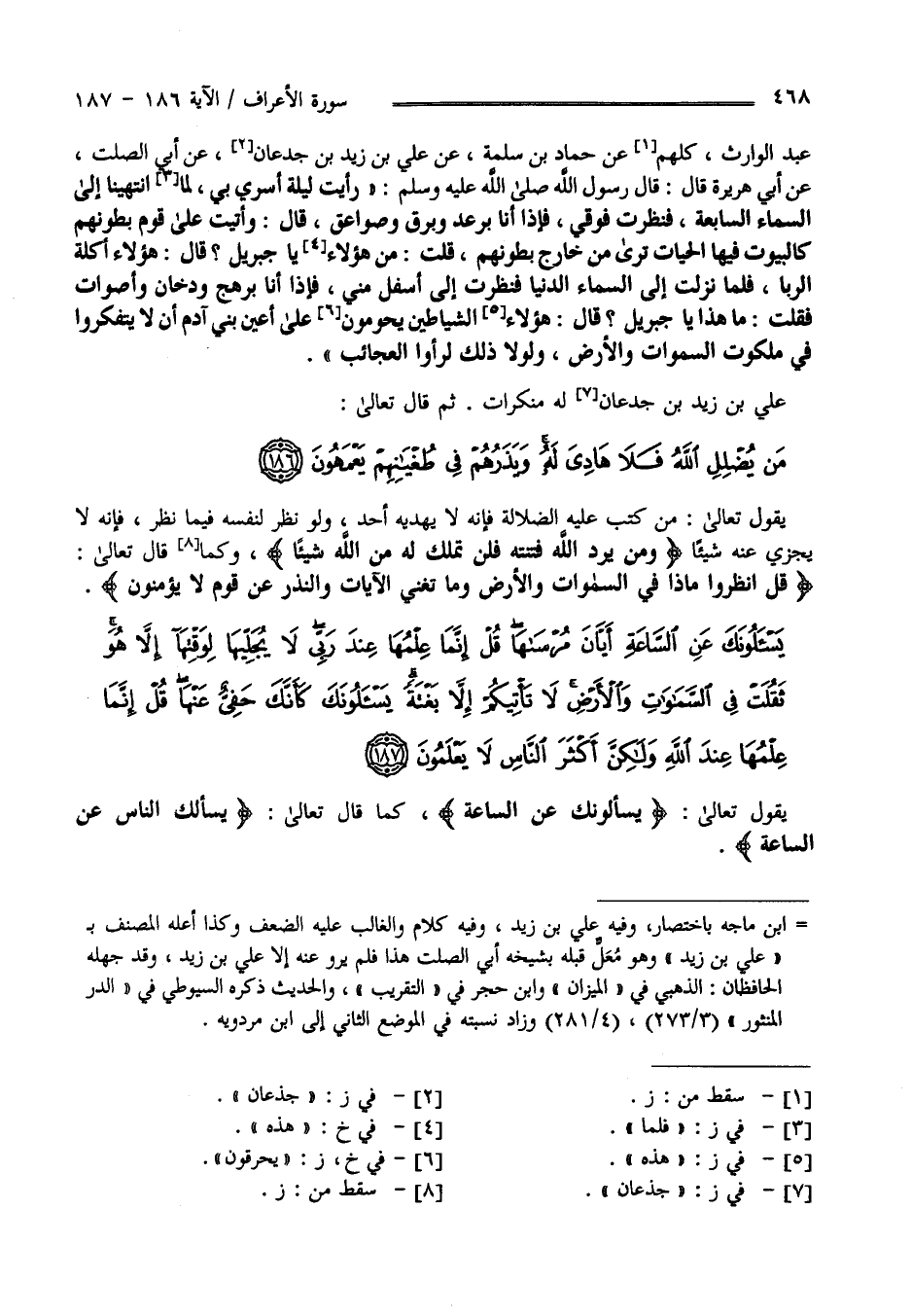 يَسْأَلُونَكَ عَنِ السَّاعَةِ أَيَّانَ مُرْسَاهَا قُلْ إِنَّمَا عِلْمُهَا عِنْدَ رَبِّي لَا يُجَلِّيهَا لِوَقْتِهَا إِلَّا هُوَ ثَقُلَتْ فِي السَّمَاوَاتِ وَالْأَرْضِ لَا تَأْتِيكُمْ إِلَّا بَغْتَةً يَسْأَلُونَكَ كَأَنَّكَ حَفِيٌّ عَنْهَا قُلْ إِنَّمَا عِلْمُهَا عِنْدَ اللَّهِ وَلَكِنَّ أَكْثَرَ النَّاسِ لَا يَعْلَمُونَ (187)