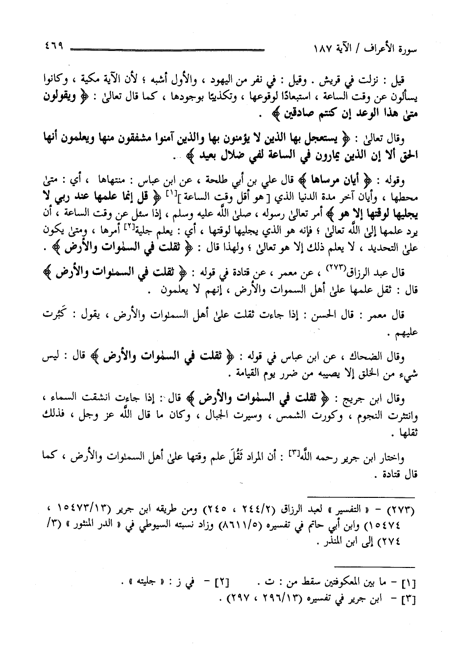 قِيلَ نَزَلَتْ فِي قُرَيْش وَقِيلَ فِي نَفَر مِنْ الْيَهُود وَالْأَوَّل أَشْبَه لِأَنَّ الْآيَة مَكِّيَّة وَكَانُوا يَسْأَلُونَ عَنْ وَقْت السَّاعَة اِسْتِبْعَادًا لِوُقُوعِهَا وَتَكْذِيبًا بِوُجُودِهَا كَمَا قَالَ تَعَالَى " وَيَقُولُونَ مَتَى هَذَا الْوَعْد إِنْ كُنْتُمْ صَادِقِينَ" وَقَالَ تَعَالَى " يَسْتَعْجِل بِهَا الَّذِينَ لَا يُؤْمِنُونَ بِهَا وَاَلَّذِينَ آمَنُوا مُشْفِقُونَ مِنْهَا وَيَعْلَمُونَ أَنَّهَا الْحَقّ أَلَا إِنَّ الَّذِينَ يُمَارُونَ فِي السَّاعَة لَفِي ضَلَال بَعِيد" وَقَوْله " أَيَّانَ مُرْسَاهَا " قَالَ عَلِيّ بْن أَبِي طَلْحَة عَنْ اِبْن عَبَّاس مُنْتَهَاهَا أَيْ مَتَى مَحَطّهَا وَأَيَّانَ آخِر مُدَّة الدُّنْيَا الَّذِي هُوَ أَوَّل وَقْت السَّاعَة " قُلْ إِنَّمَا عِلْمهَا عِنْد رَبِّي لَا يُجَلِّيهَا لِوَقْتِهَا إِلَّا هُوَ " أَمَرَ تَعَالَى رَسُوله صَلَّى اللَّه عَلَيْهِ وَسَلَّمَ إِذَا سُئِلَ عَنْ وَقْت السَّاعَة أَنْ يَرُدّ عِلْمهَا إِلَى اللَّه تَعَالَى فَإِنَّهُ هُوَ الَّذِي يُجَلِّيهَا لِوَقْتِهَا أَيْ يَعْلَم جَلِيَّة أَمْرهَا وَمَتَى يَكُون عَلَى التَّحْدِيد لَا يَعْلَم ذَلِكَ إِلَّا هُوَ تَعَالَى وَلِهَذَا قَالَ " ثَقُلَتْ فِي السَّمَاوَات وَالْأَرْض " قَالَ عَبْد الرَّزَّاق عَنْ مَعْمَر عَنْ قَتَادَة فِي قَوْله " ثَقُلَتْ فِي السَّمَاوَات وَالْأَرْض " قَالَ ثَقُلَ عِلْمهَا عَلَى أَهْل السَّمَاوَات وَالْأَرْض أَنَّهُمْ لَا يَعْلَمُونَ .