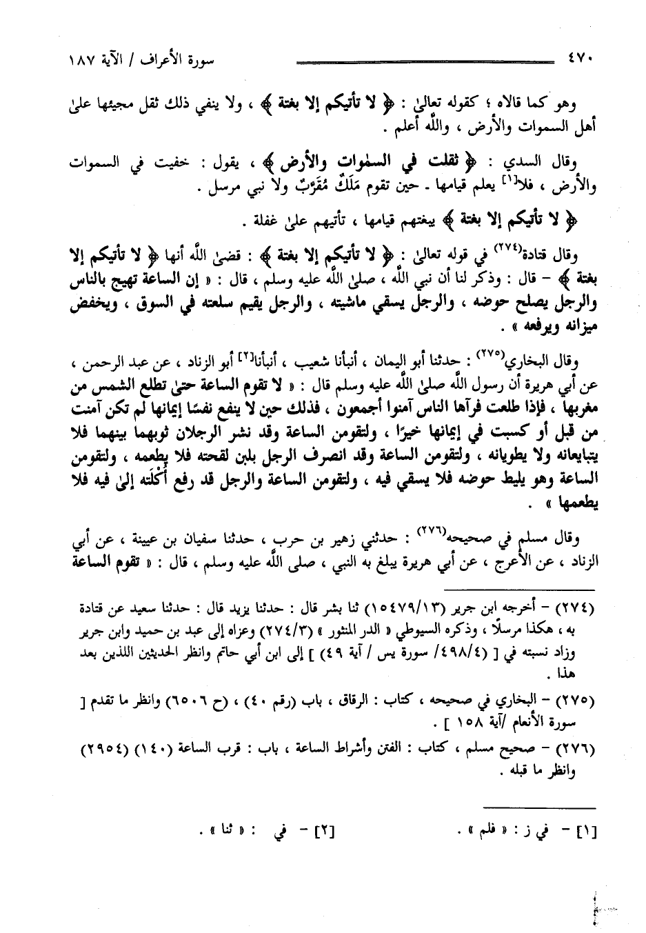 وَقَالَ قَتَادَة فِي قَوْله تَعَالَى " لَا تَأْتِيكُمْ إِلَّا بَغْتَة " قَضَى اللَّه أَنَّهَا " لَا تَأْتِيكُمْ إِلَّا بَغْتَة " قَالَ وَذُكِرَ لَنَا أَنَّ نَبِيّ اللَّه صَلَّى اللَّه عَلَيْهِ وَسَلَّمَ كَانَ يَقُول " إِنَّ السَّاعَة تَهِيج بِالنَّاسِ وَالرَّجُل يُصْلِح حَوْضه وَالرَّجُل يَسْقِي مَاشِيَته وَالرَّجُل يُقِيم سِلْعَته فِي السُّوق وَيَخْفِض مِيزَانه وَيَرْفَعهُ " وَقَالَ الْبُخَارِيّ : حَدَّثَنَا أَبُو الْيَمَان أَنْبَأَنَا شُعَيْب أَنْبَأَنَا أَبُو الزِّنَاد عَنْ عَبْد الرَّحْمَن عَنْ أَبِي هُرَيْرَة أَنَّ رَسُول اللَّه صَلَّى اللَّه عَلَيْهِ وَسَلَّمَ قَالَ " لَا تَقُوم السَّاعَة حَتَّى تَطْلُع الشَّمْس مِنْ مَغْرِبهَا فَإِذَا طَلَعَتْ وَرَآهَا النَّاس آمَنُوا أَجْمَعُونَ فَذَلِكَ حِين لَا يَنْفَع نَفْسًا إِيمَانهَا لَمْ تَكُنْ آمَنَتْ مِنْ قَبْل أَوْ كَسَبَتْ فِي إِيمَانهَا خَيْرًا وَلَتَقُومَنَّ السَّاعَة وَقَدْ نَشَرَ الرَّجُلَانِ ثَوْبهمَا بَيْنهمَا فَلَا يَتَبَايَعَانِهِ وَلَا يَطْوِيَانِهِ وَلَتَقُومَنَّ السَّاعَة وَقَدْ اِنْصَرَفَ الرَّجُل بِلَبَنِ لِقْحَته فَلَا يَطْعَمهُ وَلَتَقُومَنَّ السَّاعَة وَهُوَ يَلِيط حَوْضه فَلَا يَسْقِي فِيهِ وَلَتَقُومَنَّ السَّاعَة وَالرَّجُل قَدْ رَفَعَ أَكْلَته إِلَى فِيهِ فَلَا يَطْعَمهَا" وَقَالَ مُسْلِم فِي صَحِيحه حَدَّثَنِي زُهَيْر بْن حَرْب حَدَّثَنَا سُفْيَان بْن عُيَيْنَة عَنْ أَبِي الزِّنَاد عَنْ الْأَعْرَج عَنْ أَبِي هُرَيْرَة يَبْلُغ بِهِ قَالَ تَقُوم السَّاعَة