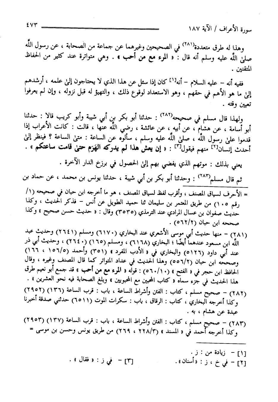 وَهَذَا لَهُ طُرُق مُتَعَدِّدَة فِي الصَّحِيحَيْنِ وَغَيْرهمَا عَنْ جَمَاعَة مِنْ الصَّحَابَة عَنْ رَسُول اللَّه صَلَّى اللَّه عَلَيْهِ وَسَلَّمَ أَنَّهُ قَالَ " الْمَرْء مَعَ مَنْ أَحَبَّ " وَهِيَ مُتَوَاتِرَة عِنْد كَثِير مِنْ الْحُفَّاظ الْمُتْقِنِينَ فَفِيهِ أَنَّهُ عَلَيْهِ السَّلَام كَانَ إِذَا سُئِلَ عَنْ هَذَا الَّذِي لَا يَحْتَاجُونَ إِلَى عِلْمه أَرْشَدَهُمْ إِلَى مَا هُوَ الْأَهَمّ فِي حَقّهمْ وَهُوَ الِاسْتِعْدَاد لِوُقُوعِ ذَلِكَ وَالتَّهَيُّؤ لَهُ قَبْل نُزُوله وَإِنْ لَمْ يَعْرِفُوا تَعْيِين وَقْته وَلِهَذَا قَالَ مُسْلِم فِي صَحِيحه : حَدَّثَنَا أَبُو بَكْر بْن أَبِي شَيْبَة وَأَبُو كُرَيْب قَالَا حَدَّثَنَا أُسَامَة عَنْ هِشَام عَنْ أَبِيهِ عَنْ عَائِشَة رَضِيَ اللَّه عَنْهَا قَالَتْ : كَانَتْ الْأَعْرَاب إِذَا قَدِمُوا عَلَى رَسُول اللَّه صَلَّى اللَّه عَلَيْهِ وَسَلَّمَ سَأَلُوهُ عَنْ السَّاعَة مَتَى السَّاعَة فَيَنْظُر إِلَى أَحْدَث إِنْسَان مِنْهُمْ فَيَقُول " إِنْ يَعِشْ هَذَا لَمْ يُدْرِكهُ الْهَرَم قَامَتْ عَلَيْكُمْ سَاعَتكُمْ " يَعْنِي بِذَلِكَ مَوْتهمْ الَّذِي يُفْضِي بِهِمْ إِلَى الْحُصُول فِي بَرْزَخ الدَّار الْآخِرَة ثُمَّ قَالَ مُسْلِم : حَدَّثَنَا أَبُو بَكْر بْن أَبِي شَيْبَة حَدَّثَنَا يُونُس بْن مُحَمَّد عَنْ حَمَّاد بْن
