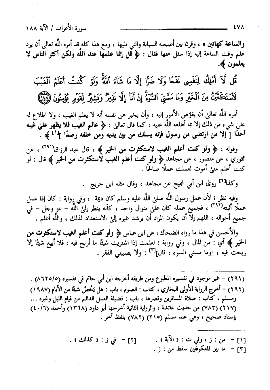 قُلْ لَا أَمْلِكُ لِنَفْسِي نَفْعًا وَلَا ضَرًّا إِلَّا مَا شَاءَ اللَّهُ وَلَوْ كُنْتُ أَعْلَمُ الْغَيْبَ لَاسْتَكْثَرْتُ مِنَ الْخَيْرِ وَمَا مَسَّنِيَ السُّوءُ إِنْ أَنَا إِلَّا نَذِيرٌ وَبَشِيرٌ لِقَوْمٍ يُؤْمِنُونَ (188)