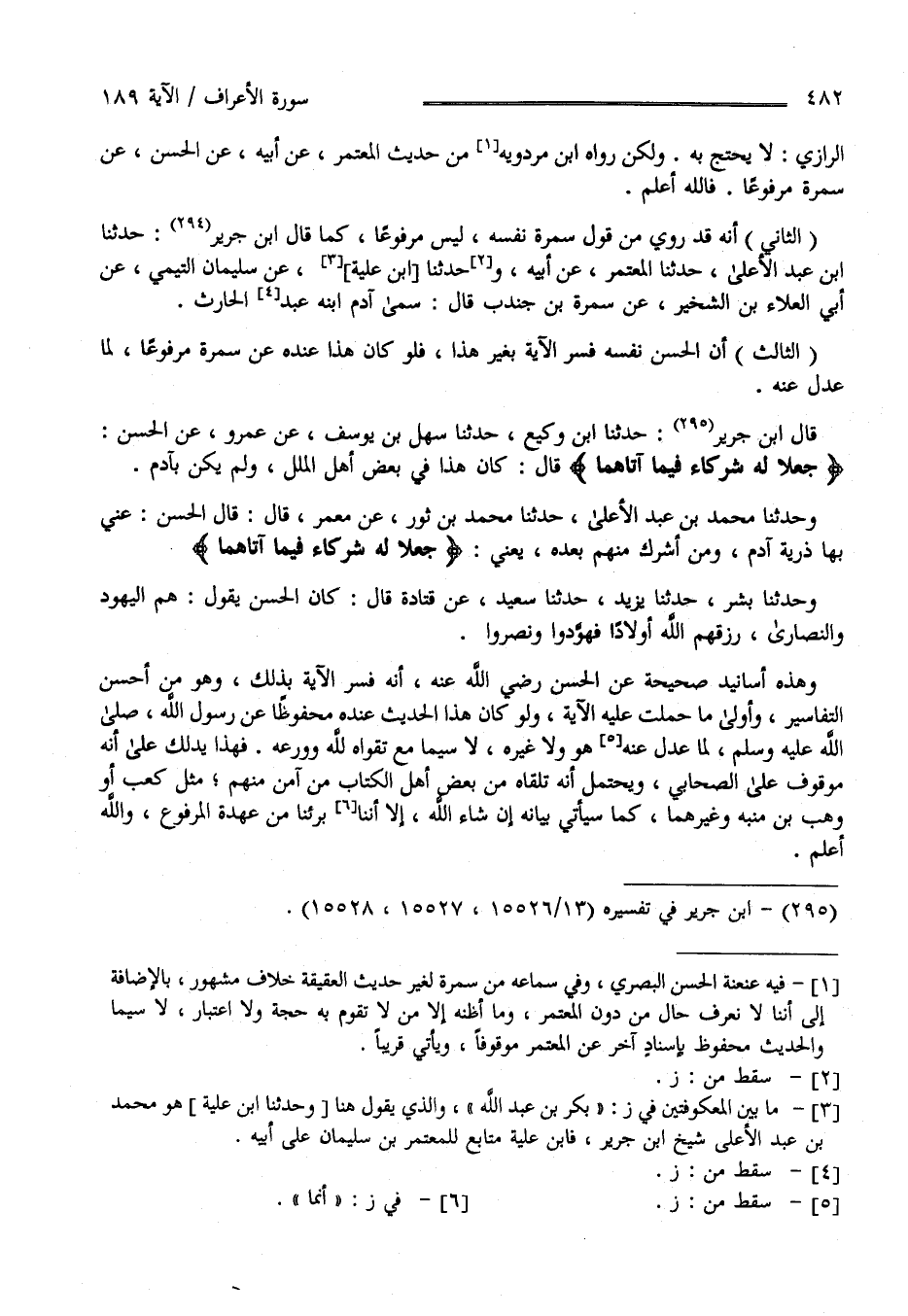 قَالَ اِبْن جَرِير : حَدَّثَنَا اِبْن وَكِيع حَدَّثَنَا سَهْل بْن يُوسُف عَنْ عَمْرو عَنْ الْحَسَن " جَعَلَا لَهُ شُرَكَاء فِيمَا آتَاهُمَا" قَالَ كَانَ هَذَا فِي بَعْض أَهْل الْمِلَل وَلَمْ يَكُنْ بِآدَم وَحَدَّثَنَا مُحَمَّد بْن عَبْد الْأَعْلَى حَدَّثَنَا مُحَمَّد بْن ثَوْر عَنْ مَعْمَر قَالَ : قَالَ الْحَسَن عَنَى بِهَا ذُرِّيَّة آدَم وَمَنْ أَشْرَكَ مِنْهُمْ بَعْده يَعْنِي " جَعَلَا لَهُ شُرَكَاء فِيمَا آتَاهُمَا " وَحَدَّثَنَا بِشْر حَدَّثَنَا يَزِيد حَدَّثَنَا سَعِيد عَنْ قَتَادَة قَالَ : كَانَ الْحَسَن يَقُول هُمْ الْيَهُود وَالنَّصَارَى رَزَقَهُمْ اللَّه أَوْلَادًا فَهَوَّدُوا وَنَصَّرُوا وَهَذِهِ أَسَانِيد صَحِيحَة عَنْ الْحَسَن رَضِيَ اللَّه عَنْهُ أَنَّهُ فَسَّرَ الْآيَة بِذَلِكَ وَهُوَ مِنْ أَحْسَن التَّفَاسِير وَأَوْلَى مَا حُمِلَتْ عَلَيْهِ الْآيَة وَلَوْ كَانَ هَذَا الْحَدِيث عِنْده مَحْفُوظًا عَنْ رَسُول اللَّه صَلَّى اللَّه عَلَيْهِ وَسَلَّمَ لَمَا عَدَلَ عَنْهُ هُوَ وَلَا غَيْره وَلَا سِيَّمَا مَعَ تَقْوَاهُ لِلَّهِ وَوَرَعه فَهَذَا يَدُلّك عَلَى أَنَّهُ مَوْقُوف عَلَى الصَّحَابِيّ وَيَحْتَمِل أَنَّهُ تَلَقَّاهُ مِنْ بَعْض أَهْل الْكِتَاب مَنْ آمَنَ مِنْهُمْ مِثْل كَعْب أَوْ وَهْب بْن مُنَبِّه وَغَيْرِهِمَا كَمَا سَيَأْتِي بَيَانه إِنْ شَاءَ اللَّه إِلَّا أَنَّنَا بَرِئْنَا مِنْ عُهْدَة الْمَرْفُوع وَاَللَّه أَعْلَم.