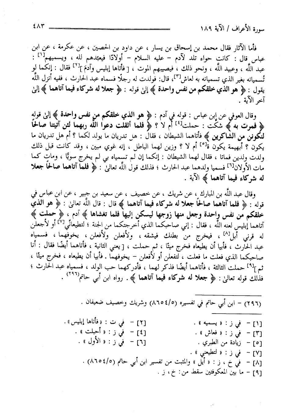 فَأَمَّا الْآثَار فَقَالَ مُحَمَّد بْن إِسْحَاق بْن يَسَار عَنْ دَاوُدَ بْن الْحُصَيْن عَنْ عِكْرِمَة عَنْ اِبْن عَبَّاس قَالَ : كَانَتْ حَوَّاء تَلِد لِآدَم عَلَيْهِ السَّلَام أَوْلَادًا فَيُعَبِّدهُمْ لِلَّهِ وَيُسَمِّيهِمْ عَبْد اللَّه وَعُبَيْد اللَّه وَنَحْو ذَلِكَ فَيُصِيبهُمْ الْمَوْت فَأَتَاهُمَا إِبْلِيس فَقَالَ إِنَّكُمَا لَوْ سَمَّيْتُمَاهُ بِغَيْرِ الَّذِي تُسَمِّيَانِهِ بِهِ لَعَاشَ قَالَ فَوَلَدَتْ لَهُ رَجُلًا فَسَمَّاهُ عَبْد الْحَارِث فَفِيهِ أَنْزَلَ اللَّه يَقُول " هُوَ الَّذِي خَلَقَكُمْ مِنْ نَفْس وَاحِدَة - إِلَى قَوْله - جَعَلَا لَهُ شُرَكَاء فِيمَا آتَاهُمَا " إِلَى آخِر الْآيَة وَقَالَ الْعَوْفِيّ عَنْ اِبْن عَبَّاس قَوْله فِي آدَم " هُوَ الَّذِي خَلَقَكُمْ مِنْ نَفْس وَاحِدَة - إِلَى قَوْله - فَمَرَّتْ بِهِ " شَكَّتْ حَمَلَتْ أَمْ لَا ؟ " فَلَمَّا أَثْقَلَتْ دَعَوَا اللَّه رَبّهمَا لَئِنْ آتَيْتنَا صَالِحًا لَنَكُونَنَّ مِنْ الشَّاكِرِينَ " فَأَتَاهُمَا الشَّيْطَان فَقَالَ هَلْ تَدْرِيَانِ مَا يُولَد لَكُمَا ؟ أَمْ هَلْ تَدْرِيَانِ مَا يَكُون أَبَهِيمَة أَمْ لَا ؟ وَزَيَّنَ لَهُمَا الْبَاطِل إِنَّهُ غَوِيّ مُبِين وَقَدْ كَانَتْ قَبْل ذَلِكَ وَلَدَتْ وَلَدَيْنِ فَمَاتَا فَقَالَ لَهُمَا الشَّيْطَان إِنَّكُمَا إِنْ لَمْ تُسَمِّيَاهُ بِي لَمْ يَخْرُج سَوِيًّا وَمَاتَ كَمَا مَاتَ الْأَوَّل فَسَمَّيَا وَلَدهمَا عَبْد الْحَارِث .