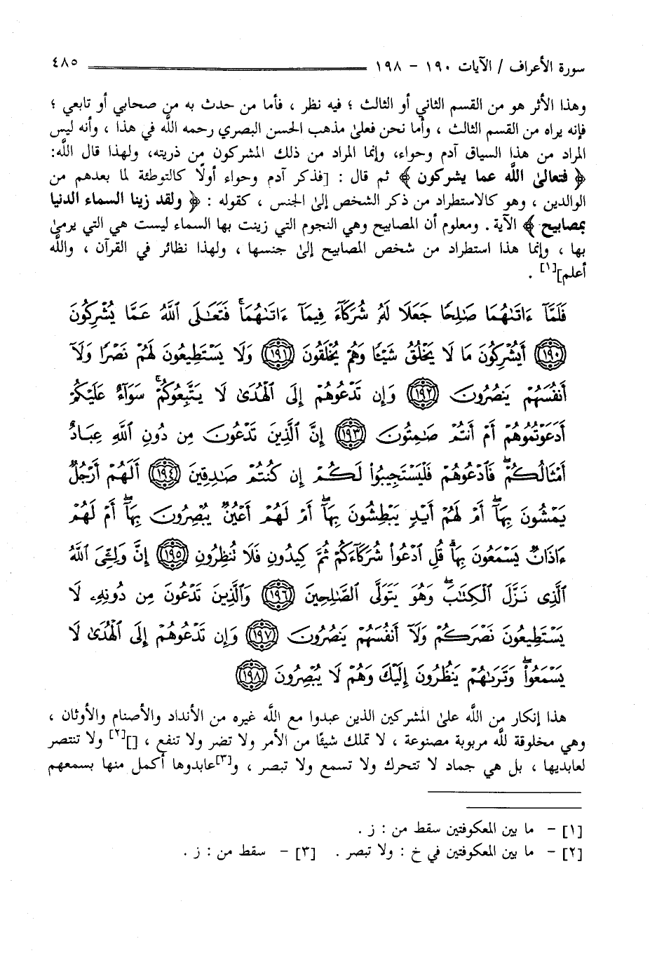 وَهَذَا الْأَثَر هُوَ الْقِسْم الثَّانِي أَوْ الثَّالِث فِيهِ نَظَر فَأَمَّا مَنْ حَدَّثَ بِهِ مِنْ صَحَابِيّ أَوْ تَابِعِيّ فَإِنَّهُ يَرَاهُ مِنْ الْقِسْم الثَّالِث وَأَمَّا نَحْنُ فَعَلَى مَذْهَب الْحَسَن الْبَصْرِيّ رَحِمَهُ اللَّه فِي هَذَا وَأَنَّهُ لَيْسَ الْمُرَاد مِنْ هَذَا السِّيَاق آدَم وَحَوَّاء وَإِنَّمَا الْمُرَاد مِنْ ذَلِكَ الْمُشْرِكُونَ مِنْ ذُرِّيَّته وَلِهَذَا قَالَ اللَّه " فَتَعَالَى اللَّه عَمَّا يُشْرِكُونَ " ثُمَّ قَالَ فَذَكَرَ آدَم وَحَوَّاء أَوَّلًا كَالتَّوْطِئَةِ لِمَا بَعْدهمَا مِنْ الْوَالِدَيْنِ وَهُوَ كَالِاسْتِطْرَادِ مِنْ ذِكْر الشَّخْص إِلَى الْجِنْس كَقَوْلِهِ " وَلَقَدْ زَيَّنَّا السَّمَاء الدُّنْيَا بِمَصَابِيح " الْآيَة وَمَعْلُوم أَنَّ الْمَصَابِيح وَهِيَ النُّجُوم الَّتِي زُيِّنَتْ بِهَا السَّمَاء لَيْسَتْ هِيَ الَّتِي يُرْمَى بِهَا وَإِنَّمَا هَذَا اِسْتِطْرَاد مِنْ شَخْص الْمَصَابِيح إِلَى جِنْسهَا وَلِهَذَا نَظَائِر فِي الْقُرْآن وَاَللَّه أَعْلَم.