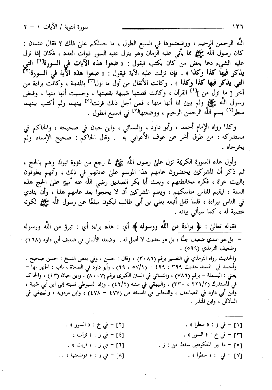 اللَّه الرَّحْمَن الرَّحِيم وَوَضَعْتُمُوهَا فِي السَّبْع الطُّوَل مَا حَمَلَكُمْ عَلَى ذَلِكَ فَقَالَ عُثْمَان : كَانَ رَسُول اللَّه صَلَّى اللَّه عَلَيْهِ وَسَلَّمَ مِمَّا يَأْتِي عَلَيْهِ الزَّمَان وَهُوَ يَنْزِل عَلَيْهِ السُّوَر ذَوَات الْعَدَد فَكَانَ إِذَا نَزَلَ عَلَيْهِ الشَّيْء دَعَا بَعْض مَنْ كَانَ يَكْتُب فَيَقُول ضَعُوا هَذِهِ الْآيَة فِي السُّورَة الَّتِي يُذْكَر فِيهَا كَذَا وَكَذَا وَكَانَتْ الْأَنْفَال مِنْ أَوَّل مَا نَزَلَ بِالْمَدِينَةِ وَكَانَتْ بَرَاءَة مِنْ آخِر مَا نَزَلَ مِنْ الْقُرْآن وَكَانَتْ قِصَّتهَا شَبِيهَة بِقِصَّتِهَا وَخَشِيت أَنَّهَا مِنْهَا وَقُبِضَ رَسُول اللَّه صَلَّى اللَّه عَلَيْهِ وَسَلَّمَ وَلَمْ يُبَيِّن لَنَا أَنَّهَا مِنْهَا فَمِنْ أَجْل ذَلِكَ قَرَنْت بَيْنهمَا وَلَمْ أَكْتُب بَيْنهمَا سَطْر بِسْمِ اللَّه الرَّحْمَن الرَّحِيم وَوَضَعْتهَا فِي السَّبْع الطُّوَل .