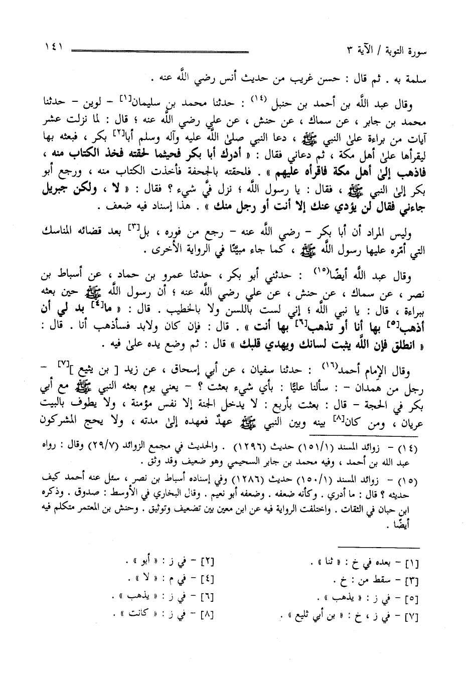 سَلَمَة ثُمَّ قَالَ : حَسَن غَرِيب مِنْ حَدِيث أَنَس رَضِيَ اللَّه عَنْهُ وَقَالَ عَبْد اللَّه بْن أَحْمَد بْن حَنْبَل : حَدَّثَنَا مُحَمَّد بْن سُلَيْمَان حَدَّثَنَا لُوَيْن حَدَّثَنَا مُحَمَّد بْن جَابِر عَنْ سِمَاك عَنْ حَنَش عَنْ عَلِيّ رَضِيَ اللَّه عَنْهُ قَالَ : لَمَّا نَزَلَتْ عَشْر آيَات مِنْ بَرَاءَة عَلَى النَّبِيّ صَلَّى اللَّه عَلَيْهِ وَسَلَّمَ دَعَا النَّبِيّ صَلَّى اللَّه عَلَيْهِ وَآله وَسَلَّمَ أَبَا بَكْر فَبَعَثَهُ بِهَا لِيَقْرَأهَا عَلَى أَهْل مَكَّة ثُمَّ دَعَانِي فَقَالَ : أَدْرِكْ أَبَا بَكْر فَحَيْثُمَا لَحِقْته فَخُذْ الْكِتَاب مِنْهُ فَاذْهَبْ إِلَى أَهْل مَكَّة فَاقْرَأْهُ عَلَيْهِمْ " فَلَحِقْته بِالْجُحْفَةِ فَأَخَذْت الْكِتَاب مِنْهُ وَرَجَعَ أَبُو بَكْر إِلَى النَّبِيّ صَلَّى اللَّه عَلَيْهِ وَسَلَّمَ فَقَالَ يَا رَسُول اللَّه نَزَلَ فِيَّ شَيْء ؟ فَقَالَ : لَا وَلَكِنَّ جِبْرِيل جَاءَنِي فَقَالَ لَنْ يُؤَدِّي عَنْك إِلَّا أَنْتَ أَوْ رَجُل مِنْك هَذَا إِسْنَاد فِيهِ ضَعْف وَلَيْسَ الْمُرَاد أَنَّ أَبَا بَكْر رَضِيَ اللَّه عَنْهُ رَجَعَ مِنْ فَوْره بَلْ بَعْد قَضَائِهِ لِلْمَنَاسِكِ الَّتِي أَمَّرَهُ عَلَيْهَا رَسُول اللَّه صَلَّى اللَّه عَلَيْهِ وَسَلَّمَ كَمَا جَاءَ مُبَيَّنًا فِي الرِّوَايَة الْأُخْرَى وَقَالَ عَبْد اللَّه أَيْضًا حَدَّثَنِي أَبُو بَكْر حَدَّثَنَا عَمْرو بْن حَمَّاد عَنْ أَسْبَاط بْن نَصْر عَنْ سِمَاك عَنْ حَنَش عَنْ عَلِيّ رَضِيَ اللَّه عَنْهُ أَنَّ رَسُول اللَّه صَلَّى اللَّه عَلَيْهِ وَسَلَّمَ حِين بَعَثَهُ بِبَرَاءَة قَالَ : يَا نَبِيّ اللَّه إِنِّي لَسْت بِاللَّسِنِ وَلَا بِالْخَطِيبِ قَالَ : لَا بُدّ لِي أَنْ أَذْهَب بِهَا أَنَا أَوْ تَذْهَب بِهَا أَنْتَ قَالَ : فَإِنْ كَانَ وَلَا بُدّ فَسَأَذْهَبُ بِهَا أَنَا قَالَ : اِنْطَلِقْ فَإِنَّ اللَّه يُثَبِّت لِسَانك وَيَهْدِي قَلْبك قَالَ ثُمَّ وَضَعَ يَده عَلَى فِيهِ .