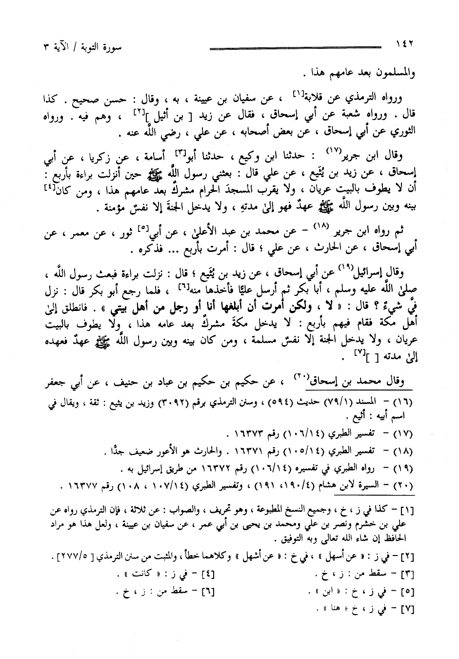 وَرَوَاهُ شُعْبَة عَنْ أَبِي إِسْحَاق فَقَالَ زَيْد بْن أُثَيْل وَهِمَ فِيهِ وَرَوَاهُ الثَّوْرِيّ عَنْ أَبِي إسْحَاق عَنْ بَعْض أَصْحَابه عَنْ عَلِيّ رَضِيَ اللَّه عَنْهُ وَقَالَ اِبْن جَرِير حَدَّثَنَا اِبْن وَكِيع حَدَّثَنَا أَبُو أُسَامَة عَنْ زَكَرِيَّا عَنْ أَبِي إِسْحَاق عَنْ زَيْد بْن يُثَيْع عَنْ عَلِيّ قَالَ : بَعَثَنِي رَسُول اللَّه صَلَّى اللَّه عَلَيْهِ وَسَلَّمَ حِين أُنْزِلَتْ بَرَاءَة بِأَرْبَعٍ : أَنْ لَا يَطُوف بِالْبَيْتِ عُرْيَان وَلَا يَقْرَب الْمَسْجِد الْحَرَام مُشْرِك بَعْد عَامهمْ هَذَا وَمَنْ كَانَ بَيْنه وَبَيْن رَسُول اللَّه صَلَّى اللَّه عَلَيْهِ وَسَلَّمَ عَهْد فَهُوَ إِلَى مُدَّته وَلَا يَدْخُل الْجَنَّة إِلَّا نَفْس مُؤْمِنَة ثُمَّ رَوَاهُ اِبْن جَرِير عَنْ مُحَمَّد بْن عَبْد الْأَعْلَى عَنْ اِبْن ثَوْر عَنْ مَعْمَر عَنْ أَبِي إسْحَاق عَنْ الْحَارِث عَنْ عَلِيّ قَالَ : أُمِرْت بِأَرْبَعٍ فَذَكَرَهُ وَقَالَ إِسْرَائِيل عَنْ أَبِي إسْحَاق عَنْ زَيْد بْن يُثَيْع قَالَ : نَزَلَتْ بَرَاءَة فَبَعَثَ رَسُول اللَّه صَلَّى اللَّه عَلَيْهِ وَسَلَّمَ أَبَا بَكْر ثُمَّ أَرْسَلَ عَلِيًّا فَأَخَذَهَا فَلَمَّا رَجَعَ أَبُو بَكْر قَالَ : نَزَلَ فِيَّ شَيْء ؟ قَالَ " لَا وَلَكِنْ أُمِرْت أَنْ أُبَلِّغهَا أَنَا أَوْ رَجُل مِنْ أَهْل بَيْتِي " فَانْطَلَقَ إِلَى أَهْل مَكَّة فَقَامَ فِيهِمْ بِأَرْبَعٍ : لَا يَدْخُل مَكَّة مُشْرِك بَعْد عَامه هَذَا وَلَا يَطُوف بِالْبَيْتِ عُرْيَان وَلَا يَدْخُل الْجَنَّة إِلَّا نَفْس مُسْلِمَة وَمَنْ كَانَ بَيْنه وَبَيْن رَسُول اللَّه صَلَّى اللَّه عَلَيْهِ وَسَلَّمَ عَهْد فَعَهْده إِلَى مُدَّته وَقَالَ مُحَمَّد بْن إِسْحَاق عَنْ حَكِيم بْن حَكِيم بْن عَبَّاد بْن حُنَيْف عَنْ أَبِي جَعْفَر