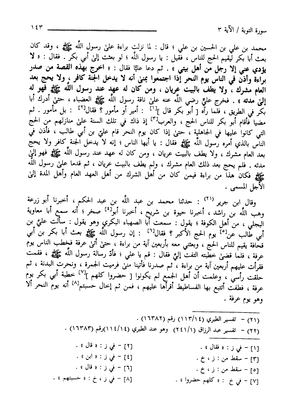 مُحَمَّد بْن عَلِيّ بْن الْحُسَيْن بْن عَلِيّ قَالَ : لَمَّا نَزَلَتْ بَرَاءَة عَلَى رَسُول اللَّه صَلَّى اللَّه عَلَيْهِ وَسَلَّمَ وَقَدْ كَانَ بَعَثَ أَبَا بَكْر لِيُقِيمَ الْحَجّ لِلنَّاسِ فَقِيلَ يَا رَسُول اللَّه : لَوْ بَعَثْت إِلَى أَبِي بَكْر فَقَالَ " لَا يُؤَدِّي عَنِّي إِلَّا رَجُل مِنْ أَهْل بَيْتِي " ثُمَّ دَعَا عَلِيًّا فَقَالَ " اِذْهَبْ بِهَذِهِ الْقِصَّة مِنْ سُورَة بَرَاءَة وَأَذِّنْ فِي النَّاس يَوْم النَّحْر إذَا اِجْتَمَعُوا بِمِنًى أَنَّهُ لَا يَدْخُل الْجَنَّة كَافِر وَلَا يَحُجّ بَعْد الْعَام مُشْرِك وَلَا يَطُوف بِالْبَيْتِ عُرْيَان وَمَنْ كَانَ لَهُ عَهْد عِنْد رَسُول اللَّه صَلَّى اللَّه عَلَيْهِ وَسَلَّمَ فَهُوَ لَهُ إِلَى مُدَّته " فَخَرَجَ عَلِيّ رَضِيَ اللَّه عَنْهُ عَلَى نَاقَة رَسُول اللَّه صَلَّى اللَّه عَلَيْهِ وَسَلَّمَ الْعَضْبَاء حَتَّى أَدْرَكَ أَبَا بَكْر فِي الطَّرِيق فَلَمَّا رَآهُ أَبُو بَكْر قَالَ : أَمِير أَوْ مَأْمُور ؟ فَقَالَ بَلْ مَأْمُور ثُمَّ مَضَيَا فَأَقَامَ أَبُو بَكْر لِلنَّاسِ الْحَجّ إِذْ ذَاكَ فِي تِلْكَ السَّنَة عَلَى مَنَازِلهمْ مِنْ الْحَجّ الَّتِي كَانُوا عَلَيْهَا فِي الْجَاهِلِيَّة حَتَّى إِذَا كَانَ يَوْم النَّحْر قَامَ عَلِيّ بْن أَبِي طَالِب فَأَذَّنَ فِي النَّاس بِالَّذِي أَمَرَهُ رَسُول اللَّه صَلَّى اللَّه عَلَيْهِ وَسَلَّمَ فَقَالَ : يَا أَيّهَا النَّاس إِنَّهُ لَا يَدْخُل الْجَنَّة كَافِر " وَلَا يَحُجّ بَعْد الْعَام مُشْرِك وَلَا يَطُوف بِالْبَيْتِ عُرْيَان وَمَنْ كَانَ لَهُ عَهْد عِنْد رَسُول اللَّه صَلَّى اللَّه عَلَيْهِ وَسَلَّمَ فَهُوَ