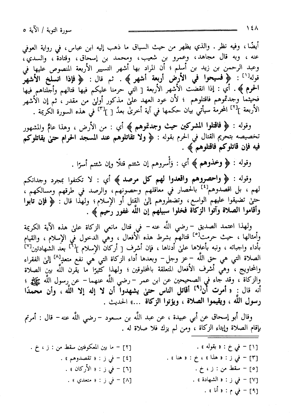 أَيْضًا وَفِيهِ نَظَر وَاَلَّذِي يَظْهَر مِنْ حَيْثُ السِّيَاق مَا ذَهَبَ إِلَيْهِ اِبْن عَبَّاس فِي رِوَايَة الْعَوْفِيّ عَنْهُ وَبِهِ قَالَ مُجَاهِد وَعَمْرو بْن شُعَيْب وَمُحَمَّد بْن إِسْحَاق وَقَتَادَة وَالسُّدِّيّ وَعَبْد الرَّحْمَن بْن زَيْد بْن أَسْلَم أَنَّ الْمُرَاد بِهَا أَشْهُر التَّسْيِير الْأَرْبَعَة الْمَنْصُوص عَلَيْهَا بِقَوْلِهِ " فَسِيحُوا فِي الْأَرْض أَرْبَعَة أَشْهُر " ثُمَّ قَالَ " فَإِذَا اِنْسَلَخَ الْأَشْهُر الْحُرُم " أَيْ إِذَا اِنْقَضَتْ الْأَشْهُر الْأَرْبَعَة الَّتِي حَرَّمْنَا عَلَيْكُمْ فِيهَا قِتَالهمْ وَأَجَّلْنَاهُمْ فِيهَا فَحَيْثُمَا وَجَدْتُمُوهُمْ فَاقْتُلُوهُمْ لِأَنَّ عَوْد الْعَهْد عَلَى مَذْكُور أَوْلَى مِنْ مُقَدَّر ثُمَّ إِنَّ الْأَشْهُر الْأَرْبَعَة الْمُحَرَّمَة سَيَأْتِي بَيَان حُكْمهَا فِي آيَة أُخْرَى بَعْد فِي هَذِهِ السُّورَة الْكَرِيمَة وَقَوْله " فَاقْتُلُوا الْمُشْرِكِينَ حَيْثُ وَجَدْتُمُوهُمْ " أَيْ مِنْ الْأَرْض وَهَذَا عَامّ وَالْمَشْهُور تَخْصِيصه بِتَحْرِيمِ الْقِتَال فِي الْحَرَم بِقَوْلِهِ " وَلَا تُقَاتِلُوهُمْ عِنْد الْمَسْجِد الْحَرَام حَتَّى يُقَاتِلُوكُمْ فِيهِ فَإِنْ قَاتَلُوكُمْ فَاقْتُلُوهُمْ " وَقَوْله " وَخُذُوهُمْ " أَيْ وَأْسِرُوهُمْ إِنْ شِئْتُمْ قَتْلًا وَإِنْ شِئْتُمْ أَسْرًا وَقَوْله " وَاحْصُرُوهُمْ وَاقْعُدُوا لَهُمْ كُلّ مَرْصَد " أَيْ لَا تَكْتَفُوا بِمُجَرَّدِ وِجْدَانكُمْ لَهُمْ بَلْ اِقْصِدُوهُمْ بِالْحِصَارِ فِي مَعَاقِلهمْ وَحُصُونهمْ وَالرَّصْد فِي طُرُقهمْ وَمَسَالِكهمْ حَتَّى تُضَيِّقُوا عَلَيْهِمْ الْوَاسِع وَتَضْطَرُّوهُمْ إِلَى الْقَتْل أَوْ الْإِسْلَام وَلِهَذَا قَالَ " فَإِنْ تَابُوا وَأَقَامُوا الصَّلَاة وَآتَوْا الزَّكَاة فَخَلُّوا سَبِيلهمْ إِنَّ اللَّه غَفُور رَحِيم " وَلِهَذَا اِعْتَمَدَ الصِّدِّيق رَضِيَ اللَّه عَنْهُ فِي قِتَال مَانِعِي الزَّكَاة عَلَى هَذِهِ الْآيَة الْكَرِيمَة وَأَمْثَالهَا حَيْثُ حَرَّمَتْ قِتَالهمْ بِشَرْطِ هَذِهِ الْأَفْعَال وَهِيَ الدُّخُول فِي الْإِسْلَام وَالْقِيَام بِأَدَاءِ وَاجِبَاته وَنُبِّهَ بِأَعْلَاهَا عَلَى أَدْنَاهَا فَإِنَّ أَشْرَفَ أَرْكَان الْإِسْلَام بَعْد الشَّهَادَتَيْنِ الصَّلَاة الَّتِي هِيَ حَقّ اللَّه عَزَّ وَجَلَّ وَبَعْدهَا أَدَاء الزَّكَاة الَّتِي هِيَ نَفْع مُتَعَدٍّ إِلَى الْفُقَرَاء وَالْمَحَاوِيج وَهِيَ أَشْرَف الْأَفْعَال الْمُتَعَلِّقَة بِالْمَخْلُوقِينَ وَلِهَذَا كَثِيرًا مَا يَقْرِن اللَّه بَيْن الصَّلَاة وَالزَّكَاة وَقَدْ جَاءَ فِي الصَّحِيحَيْنِ عَنْ اِبْن عُمَر رَضِيَ اللَّه عَنْهُمَا عَنْ رَسُول اللَّه صَلَّى اللَّه عَلَيْهِ وَسَلَّمَ أَنَّهُ قَالَ " أُمِرْت أَنْ أُقَاتِل النَّاس حَتَّى يَشْهَدُوا أَنْ لَا إِلَه إِلَّا اللَّه وَأَنَّ مُحَمَّدًا رَسُول اللَّه وَيُقِيمُوا الصَّلَاة وَيُؤْتُوا الزَّكَاة " الْحَدِيث