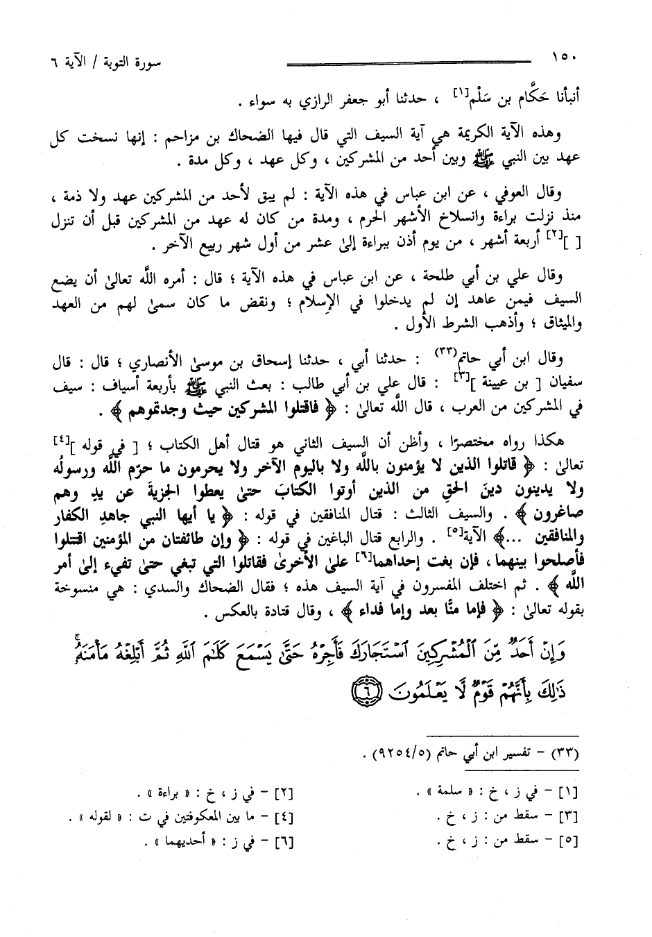 أَنْبَأَنَا حَكَّام بْن سَلَمَة حَدَّثَنَا أَبُو جَعْفَر الرَّازِيّ بِهِ سَوَاء وَهَذِهِ الْآيَة الْكَرِيمَة هِيَ آيَة السَّيْف الَّتِي قَالَ فِيهَا الضَّحَّاك بْن مُزَاحِم أَنَّهَا نَسَخَتْ كُلّ عَهْد بَيْن النَّبِيّ صَلَّى اللَّه عَلَيْهِ وَسَلَّمَ وَبَيْن أَحَد مِنْ الْمُشْرِكِينَ وَكُلّ عَقْد وَكُلّ مُدَّة وَقَالَ الْعَوْفِيّ عَنْ اِبْن عَبَّاس فِي هَذِهِ الْآيَة : لَمْ يَبْقَ لِأَحَدٍ مِنْ الْمُشْرِكِينَ عَهْد وَلَا ذِمَّة مُنْذُ نَزَلَتْ بَرَاءَة وَانْسِلَاخ الْأَشْهُر الْحُرُم وَمُدَّة مَنْ كَانَ لَهُ عَهْد مِنْ الْمُشْرِكِينَ قَبْل أَنْ تَنْزِل بَرَاءَة أَرْبَعَة أَشْهُر مِنْ يَوْم أَذَّنَ بِبَرَاءَة إِلَى عَشْر مِنْ أَوَّل شَهْر رَبِيع الْآخِر وَقَالَ عَلِيّ بْن أَبِي طَلْحَة عَنْ اِبْن عَبَّاس فِي هَذِهِ الْآيَة قَالَ : أَمَرَهُ اللَّه تَعَالَى أَنْ يَضَع السَّيْف فِيمَنْ عَاهَدَ إِنْ لَمْ يَدْخُلُوا فِي الْإِسْلَام وَنَقْض مَا كَانَ سُمِّيَ لَهُمْ مِنْ الْعَقْد وَالْمِيثَاق وَأَذْهَبَ الشَّرْط الْأَوَّل وَقَالَ اِبْن أَبِي حَاتِم حَدَّثَنَا أَبِي حَدَّثَنَا إسْحَاق بْن مُوسَى الْأَنْصَارِيّ قَالَ : قَالَ سُفْيَان بْن عُيَيْنَة قَالَ عَلِيّ بْن أَبِي طَالِب : بُعِثَ النَّبِيّ صَلَّى اللَّه عَلَيْهِ وَسَلَّمَ بِأَرْبَعَةِ أَسْيَاف سَيْف فِي الْمُشْرِكِينَ مِنْ الْعَرَب قَالَ اللَّه تَعَالَى " فَاقْتُلُوا الْمُشْرِكِينَ حَيْثُ وَجَدْتُمُوهُمْ " هَكَذَا رَوَاهُ مُخْتَصَرًا وَأَظُنّ أَنَّ السَّيْف الثَّانِي هُوَ قِتَال أَهْل الْكِتَاب لِقَوْلِهِ تَعَالَى " قَاتِلُوا الَّذِينَ لَا يُؤْمِنُونَ بِاَللَّهِ وَلَا بِالْيَوْمِ الْآخِر وَلَا يُحَرِّمُونَ مَا حَرَّمَ اللَّه وَرَسُوله وَلَا يَدِينُونَ دِين الْحَقّ مِنْ الَّذِينَ أُوتُوا الْكِتَاب حَتَّى يُعْطُوا الْجِزْيَة عَنْ يَد وَهُمْ صَاغِرُونَ " " وَالسَّيْف الثَّالِث " قِتَال الْمُنَافِقِينَ فِي قَوْله " يَا أَيّهَا النَّبِيّ جَاهِدْ الْكُفَّار وَالْمُنَافِقِينَ " الْآيَة .
