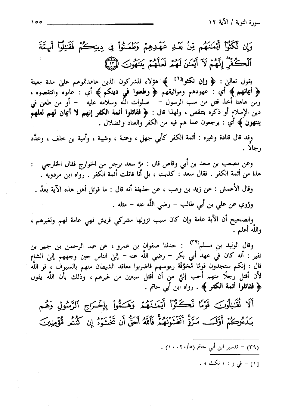 وَإِنْ نَكَثُوا أَيْمَانَهُمْ مِنْ بَعْدِ عَهْدِهِمْ وَطَعَنُوا فِي دِينِكُمْ فَقَاتِلُوا أَئِمَّةَ الْكُفْرِ إِنَّهُمْ لَا أَيْمَانَ لَهُمْ لَعَلَّهُمْ يَنْتَهُونَ