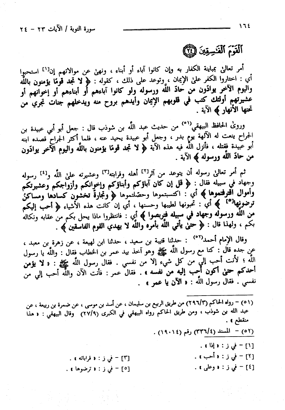 قُلْ إِنْ كَانَ آبَاؤُكُمْ وَأَبْنَاؤُكُمْ وَإِخْوَانُكُمْ وَأَزْوَاجُكُمْ وَعَشِيرَتُكُمْ وَأَمْوَالٌ اقْتَرَفْتُمُوهَا وَتِجَارَةٌ تَخْشَوْنَ كَسَادَهَا وَمَسَاكِنُ تَرْضَوْنَهَا أَحَبَّ إِلَيْكُمْ مِنَ اللَّهِ وَرَسُولِهِ وَجِهَادٍ فِي سَبِيلِهِ فَتَرَبَّصُوا حَتَّى يَأْتِيَ اللَّهُ بِأَمْرِهِ وَاللَّهُ لَا يَهْدِي الْقَوْمَ الْفَاسِقِينَ