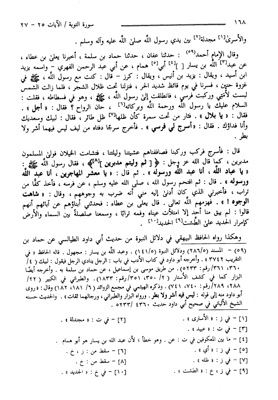 وَالْأَسْرَى مُجَنْدَلَة بَيْن يَدَيْ رَسُول اللَّه صَلَّى اللَّه عَلَيْهِ وَآله وَسَلَّمَ وَقَالَ الْإِمَام أَحْمَد : حَدَّثَنَا عَفَّان حَدَّثَنَا حَمَّاد بْن سَلَمَة أَخْبَرَنَا يَعْلَى بْن عَطَاء عَنْ عُبَيْد اللَّه بْن سَيَّار عَنْ أَبِي هَمَّام عَنْ أَبِي عَبْد الرَّحْمَن الْفِهْرِيّ وَاسْمه يَزِيد بْن أُسَيْد وَيُقَال يَزِيد بْن أُنَيْس وَيُقَال كُرْز قَالَ : كُنْت مَعَ رَسُول اللَّه صَلَّى اللَّه عَلَيْهِ وَسَلَّمَ فِي غَزْوَة حُنَيْن فَسِرْنَا فِي يَوْم قَائِظ شَدِيد الْحَرّ فَنَزَلْنَا تَحْت ظِلَال الشَّجَر فَلَمَّا زَالَتْ الشَّمْس لَبِسْت لَأْمَتِي وَرَكِبْت فَرَسِي فَانْطَلَقْت إِلَى رَسُول اللَّه صَلَّى اللَّه عَلَيْهِ وَسَلَّمَ وَهُوَ فِي فُسْطَاطه فَقُلْت : السَّلَام عَلَيْك يَا رَسُول اللَّه وَرَحْمَة اللَّه وَبَرَكَاته حَانَ الرَّوَاح ؟ فَقَالَ " أَجَل " فَقَالَ " يَا بِلَال " فَثَارَ مِنْ تَحْت سَمُرَة كَأَنَّ ظِلّهَا ظِلّ طَائِر فَقَالَ : لَبَّيْكَ وَسَعْدَيْكَ وَأَنَا فِدَاؤُك فَقَالَ " أَسْرِجْ لِي فَرَسِي " فَأَخْرَجَ سَرْجًا دَفَّتَاهُ مِنْ لِيف لَيْسَ فِيهِمَا أَشَر وَلَا بَطَر قَالَ فَأَسْرَعَ فَرَكِبَ وَرَكِبْنَا فَصَافَفْنَاهُمْ عَشِيَّتنَا وَلَيْلَتنَا فَتَشَامَتَ الْخَيْلَانِ فَوَلَّى الْمُسْلِمُونَ مُدْبِرِينَ كَمَا قَالَ اللَّه تَعَالَى " ثُمَّ وَلَّيْتُمْ مُدْبِرِينَ " فَقَالَ رَسُول اللَّه صَلَّى اللَّه عَلَيْهِ وَسَلَّمَ " يَا عِبَاد اللَّه أَنَا عَبْد اللَّه وَرَسُوله " ثُمَّ قَالَ : يَا مَعْشَر الْمُهَاجِرِينَ أَنَا عَبْد اللَّه وَرَسُوله " قَالَ : ثُمَّ اِقْتَحَمَ عَنْ فَرَسه فَأَخَذَ كَفًّا مِنْ تُرَاب فَأَخْبَرَنِي الَّذِي كَانَ أَدْنَى إِلَيْهِ مِنِّي أَنَّهُ ضَرَبَ بِهِ وُجُوههمْ وَقَالَ " شَاهَت الْوُجُوه " فَهَزَمَهُمْ اللَّه تَعَالَى .