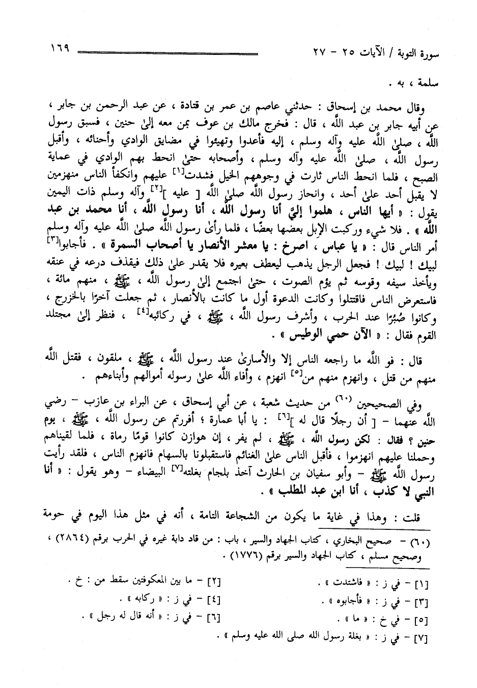 سَلَمَة بِهِ وَقَالَ مُحَمَّد بْن إِسْحَاق حَدَّثَنِي عَاصِم بْن عُمَر بْن قَتَادَة عَنْ عَبْد الرَّحْمَن بْن جَابِر عَنْ أَبِيهِ عَنْ عَبْد اللَّه قَالَ : فَخَرَجَ مَالِك بْن عَوْف بِمَنْ مَعَهُ إِلَى حُنَيْن فَسَبَقَ رَسُول اللَّه صَلَّى اللَّه عَلَيْهِ وَسَلَّمَ فَأَعَدُّوا وَتَهَيَّئُوا فِي مَضَايِق الْوَادِي وَأَحْنَائِهِ وَأَقْبَلَ رَسُول اللَّه صَلَّى اللَّه عَلَيْهِ وَآله وَسَلَّمَ وَأَصْحَابه حَتَّى اِنْحَطَّ بِهِمْ الْوَادِي فِي عَمَايَة الصُّبْح فَلَمَّا اِنْحَطَّ النَّاس ثَارَتْ فِي وُجُوههمْ الْخَيْل فَشَدَّتْ عَلَيْهِمْ وَانْكَفَأَ النَّاس مُنْهَزِمِينَ لَا يُقْبِل أَحَد عَلَى أَحَد وَانْحَازَ رَسُول اللَّه صَلَّى اللَّه عَلَيْهِ وَآله وَسَلَّمَ ذَات الْيَمِين يَقُول " أَيّهَا النَّاس هَلُمُّوا إِلَيَّ أَنَا رَسُول اللَّه أَنَا مُحَمَّد بْن عَبْد اللَّه " فَلَا شَيْء وَرَكِبَتْ الْإِبِل بَعْضهَا بَعْضًا فَلَمَّا رَأَى رَسُول اللَّه صَلَّى اللَّه عَلَيْهِ وَآله وَسَلَّمَ أَمْر النَّاس قَالَ يَا عَبَّاس اُصْرُخْ يَا مَعْشَر الْأَنْصَار يَا أَصْحَاب السَّمُرَة " فَأَجَابُوهُ لَبَّيْكَ لَبَّيْكَ فَجَعَلَ الرَّجُل يَذْهَب لِيَعْطِف بَعِيره فَلَا يَقْدِر عَلَى ذَلِكَ فَيَقْذِف دِرْعه فِي عُنُقه وَيَأْخُذ سَيْفه وَقَوْسه ثُمَّ يَؤُمّ الصَّوْت حَتَّى اِجْتَمَعَ إِلَى رَسُول اللَّه صَلَّى اللَّه عَلَيْهِ وَسَلَّمَ مِنْهُمْ مِائَة فَاسْتَعْرَضَ النَّاس فَاقْتَتَلُوا وَكَانَتْ الدَّعْوَة أَوَّل مَا كَانَتْ بِالْأَنْصَارِ ثُمَّ جُعِلَتْ آخِرًا بِالْخَزْرَجِ وَكَانُوا صُبَرَاء عِنْد الْحَرْب وَأَشْرَفَ رَسُول اللَّه صَلَّى اللَّه عَلَيْهِ وَسَلَّمَ فِي رِكَابِه فَنَظَرَ إلَى مُجْتَلَد الْقَوْم فَقَالَ الْآنَ حَمِيَ الْوَطِيس قَالَ فَوَاللَّهِ مَا رَاجَعَهُ النَّاس إلَّا وَالْأَسَارَى عِنْدَ رَسُول اللَّهِ صَلَّى اللَّه عَلَيْهِ وَسَلَّمَ مُلْقَوْنَ فَقَتَلَ اللَّه مِنْهُمْ مَنْ قَتَلَ وَانْهَزَمَ مِنْهُمْ مَنْ اِنْهَزَمَ وَأَفَاءَ اللَّه عَلَى رَسُوله أَمْوَالهمْ وَأَبْنَاءَهُمْ وَفِي الصَّحِيحَيْنِ مِنْ حَدِيث شُعْبَة عَنْ أَبِي إِسْحَاق عَنْ الْبَرَاء بْن عَازِب رَضِيَ اللَّه عَنْهُمَا أَنَّ رَجُلًا قَالَ لَهُ : يَا أَبَا عُمَارَة أَفَرَرْتُمْ عَنْ رَسُول اللَّه صَلَّى اللَّه عَلَيْهِ وَسَلَّمَ يَوْم حُنَيْن ؟ فَقَالَ لَكِنَّ رَسُول اللَّه صَلَّى اللَّه عَلَيْهِ وَسَلَّمَ لَمْ يَفِرّ إِنَّ هَوَازِن كَانُوا قَوْمًا رُمَاة فَلَمَّا لَقِينَاهُمْ وَحَمَلْنَا عَلَيْهِمْ اِنْهَزَمُوا فَأَقْبَلَ النَّاس عَلَى الْغَنَائِم فَاسْتَقْبَلُونَا بِالسِّهَامِ فَانْهَزَمَ النَّاس فَلَقَدْ رَأَيْت رَسُول اللَّه صَلَّى اللَّه عَلَيْهِ وَسَلَّمَ وَأَبُو سُفْيَان بْن الْحَارِث آخِذ بِلِجَامِ بَغْلَته الْبَيْضَاء وَهُوَ يَقُول " أَنَا النَّبِيّ لَا كَذِب أَنَا اِبْن عَبْد الْمُطَّلِب " قُلْت : وَهَذَا فِي غَايَة مَا يَكُون مِنْ الشَّجَاعَة التَّامَّة أَنَّهُ فِي مِثْل هَذَا الْيَوْم فِي