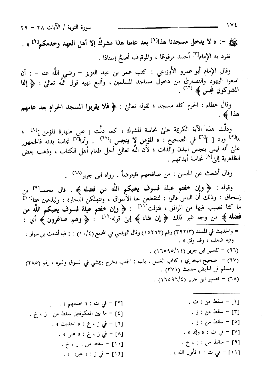 صَلَّى اللَّه عَلَيْهِ وَسَلَّمَ لَا يَدْخُل مَسْجِدنَا بَعْد عَامنَا هَذَا مُشْرِك إِلَّا أَهْل الْعَهْد وَخَدَمهمْ " تَفَرَّدَ بِهِ الْإِمَام أَحْمَد مَرْفُوعًا وَالْمَوْقُوف أَصَحّ إِسْنَادًا وَقَالَ الْإِمَام أَبُو عُمَر وَالْأَوْزَاعِيّ : كَتَبَ عُمَر بْن عَبْد الْعَزِيز رَضِيَ اللَّه عَنْهُ أَنْ اِمْنَعُوا الْيَهُود وَالنَّصَارَى مِنْ دُخُول مَسَاجِد الْمُسْلِمِينَ وَأَتْبَعَ نَهْيه قَوْل اللَّه تَعَالَى " إِنَّمَا الْمُشْرِكُونَ نَجَس " وَقَالَ عَطَاء : الْحَرَم كُلّه مَسْجِد لِقَوْلِهِ تَعَالَى " فَلَا يَقْرَبُوا الْمَسْجِد الْحَرَام بَعْد يَوْمهمْ هَذَا " وَدَلَّتْ هَذِهِ الْآيَة الْكَرِيمَة عَلَى نَجَاسَة الْمُشْرِك كَمَا وَرَدَ فِي الصَّحِيح " الْمُؤْمِن لَا يَنْجُس " وَأَمَّا نَجَاسَة بَدَنه فَالْجُمْهُور عَلَى أَنَّهُ لَيْسَ بِنَجِسِ الْبَدَن وَالذَّات لِأَنَّ اللَّه تَعَالَى أَحَلَّ طَعَام أَهْل الْكِتَاب وَذَهَبَ بَعْض الظَّاهِرِيَّة إِلَى نَجَاسَة أَبْدَانهمْ وَقَالَ أَشْعَث عَنْ الْحَسَن : مَنْ صَافَحَهُمْ فَلْيَتَوَضَّأْ رَوَاهُ اِبْن جَرِير وَقَوْله " إِنْ خِفْتُمْ عَيْلَة فَسَوْفَ يُغْنِيكُمْ اللَّه مِنْ فَضْله " قَالَ مُحَمَّد بْن إِسْحَاق : وَذَلِكَ أَنَّ النَّاس قَالُوا : لَتُقْطَعَنَّ عَنَّا الْأَسْوَاق وَلَتَهْلِكَنَّ التِّجَارَة وَلَيَذْهَبَنَّ عَنَّا مَا كُنَّا نُصِيب فِيهَا مِنْ الْمَرَافِق فَأَنْزَلَ اللَّه " وَإِنْ خِفْتُمْ عَيْلَة فَسَوْفَ يُغْنِيكُمْ اللَّه مِنْ فَضْله " مِنْ وَجْه غَيْر ذَلِكَ " إِنْ شَاءَ " إِلَى قَوْله " وَهُمْ صَاغِرُونَ " أَيْ