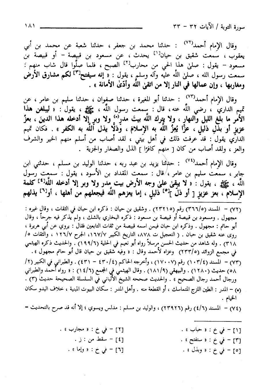 وَقَالَ الْإِمَام أَحْمَد : حَدَّثَنَا أَبُو الْمُغِيرَة حَدَّثَنَا صَفْوَان حَدَّثَنَا سُلَيْم بْن عَامِر عَنْ تَمِيم الدَّارِيّ رَضِيَ اللَّه عَنْهُ قَالَ : سَمِعْت رَسُول اللَّه صَلَّى اللَّه عَلَيْهِ وَسَلَّمَ يَقُول " لَيَبْلُغَنَّ هَذَا الْأَمْر مَا بَلَغَ اللَّيْل وَالنَّهَار وَلَا يَتْرُك اللَّه بَيْت مَدَر وَلَا وَبَر إِلَّا أَدْخَلَهُ هَذَا الدِّين يُعِزّ عَزِيزًا وَيُذِلّ ذَلِيلًا عِزًّا يُعِزّ اللَّه بِهِ الْإِسْلَام وَذُلًّا يُذِلّ اللَّه بِهِ الْكُفْر " فَكَانَ تَمِيم الدَّارِيّ يَقُول : قَدْ عَرَفْت ذَلِكَ فِي أَهْل بَيْتِي لَقَدْ أَصَابَ مَنْ أَسْلَمَ مِنْهُمْ الْخَيْر وَالشَّرَف وَالْعِزّ وَلَقَدْ أَصَابَ مَنْ كَانَ كَافِرًا مِنْهُمْ الذُّلّ وَالصَّغَار وَالْجِزْيَة .