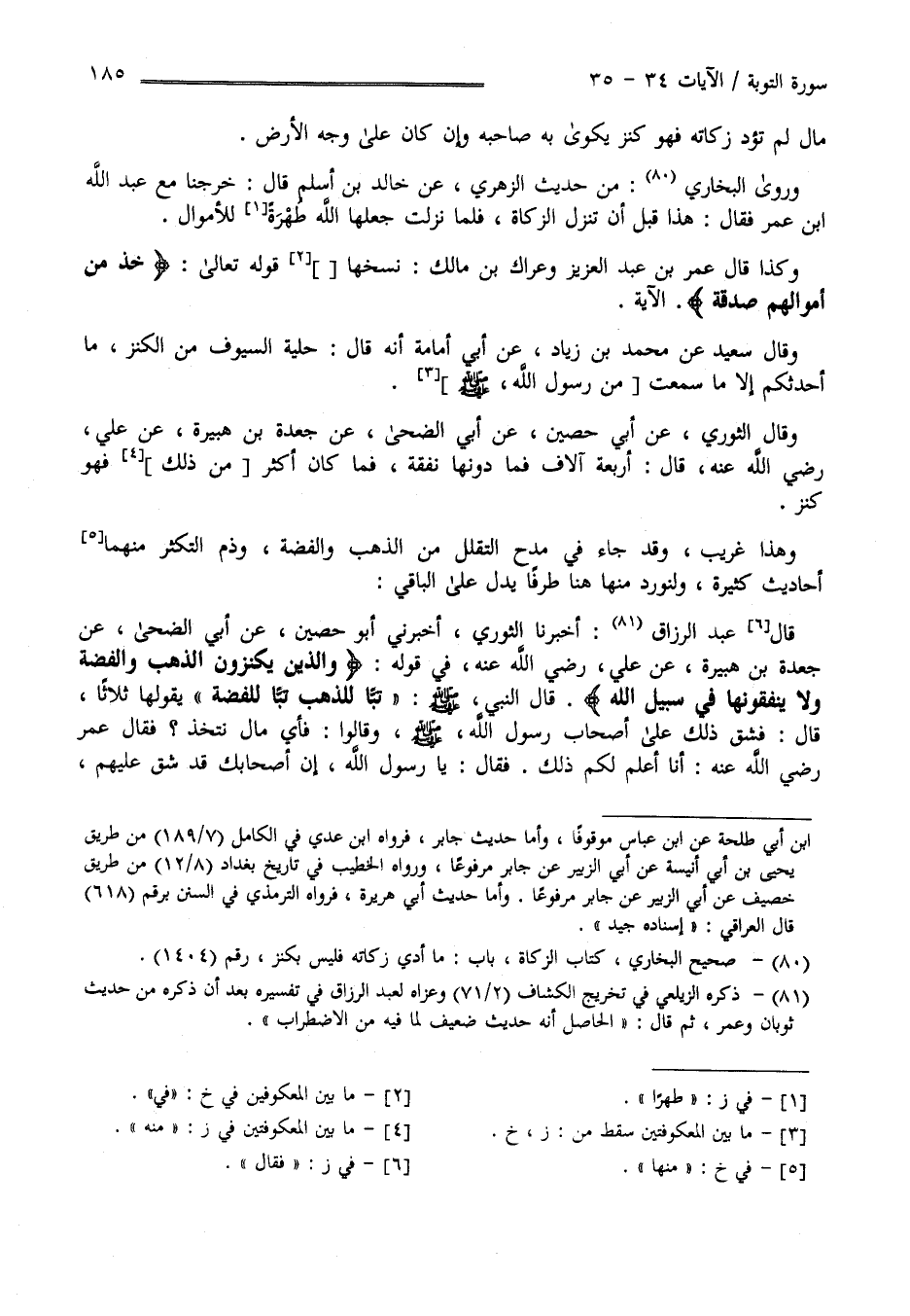 وَقَدْ جَاءَ فِي مَدْح التَّقَلُّل مِنْ الذَّهَب وَالْفِضَّة وَذَمّ التَّكَثُّر مِنْهَا أَحَادِيث كَثِيرَة وَلْنُورِدْ مِنْهَا هُنَا طَرَفًا يَدُلّ عَلَى الْبَاقِي قَالَ عَبْد الرَّازِق : أَخْبَرَنَا الثَّوْرِيّ أَخْبَرَنِي أَبُو حُصَيْن عَنْ أَبِي الضُّحَى عَنْ جَعْدَة بْن هُبَيْرَة عَنْ عَلِيّ رَضِيَ اللَّه عَنْهُ فِي قَوْله " وَاَلَّذِينَ يَكْنِزُونَ الذَّهَب وَالْفِضَّة " الْآيَة قَالَ النَّبِيّ صَلَّى اللَّه عَلَيْهِ وَسَلَّمَ " تَبًّا لِلذَّهَبِ تَبًّا لِلْفِضَّةِ " يَقُولهَا ثَلَاثًا قَالَ فَشَقَّ ذَلِكَ عَلَى أَصْحَاب رَسُول اللَّه صَلَّى اللَّه عَلَيْهِ وَسَلَّمَ وَقَالُوا فَأَيّ مَال نَتَّخِذ ؟ فَقَالَ عُمَر رَضِيَ اللَّه عَنْهُ أَنَا أَعْلَم لَكُمْ ذَلِكَ فَقَالَ : يَا رَسُول اللَّه إِنَّ أَصْحَابك قَدْ شَقَّ عَلَيْهِمْ