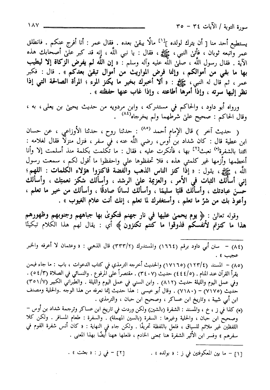 فَقَالَ رَسُول اللَّه صَلَّى اللَّه عَلَيْهِ وَآله وَسَلَّمَ " إِنَّ اللَّه لَمْ يَفْرِض الزَّكَاة إِلَّا لِيُطَيِّب بِهَا مَا بَقِيَ مِنْ أَمْوَالكُمْ وَإِنَّمَا فَرَضَ الْمَوَارِيث مِنْ أَمْوَال تَبْقَى بَعْدكُمْ " قَالَ فَكَبَّرَ عُمَر ثُمَّ قَالَ لَهُ النَّبِيّ صَلَّى اللَّه عَلَيْهِ وَسَلَّمَ " أَلَا أُخْبِرك بِخَيْرِ مَا يَكْنِز الْمَرْء الْمَرْأَة الصَّالِحَة الَّتِي إِذَا نَظَرَ إِلَيْهَا سَرَّتْهُ وَإِذَا أَمَرَهَا أَطَاعَتْهُ وَإِذَا غَابَ عَنْهَا حَفِظَتْهُ " وَرَوَاهُ أَبُو دَاوُد وَالْحَاكِم فِي مُسْتَدْرَكه وَابْن مَرْدَوَيْهِ مِنْ حَدِيث يَحْيَى بْن يَعْلَى بِهِ وَقَالَ الْحَاكِم صَحِيح عَلَى شَرْطهمَا وَلَمْ يُخَرِّجَاهُ .