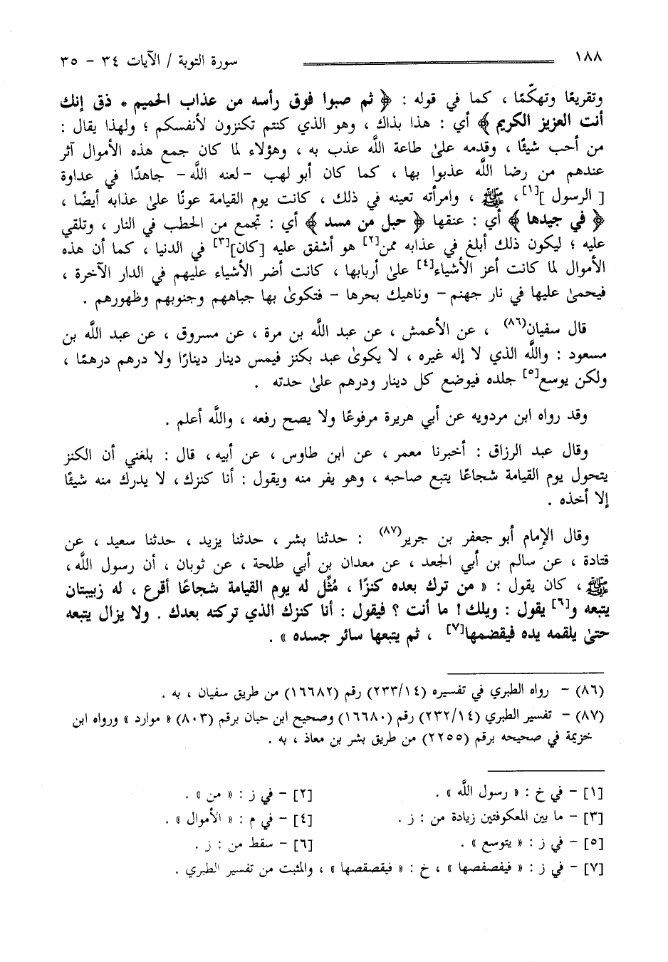 وَقَالَ الْإِمَام أَبُو جَعْفَر بْن جَرِير : حَدَّثَنَا بِشْر حَدَّثَنَا يَزِيد حَدَّثَنَا سَعِيد عَنْ قَتَادَة عَنْ سَالِم بْن أَبِي الْجَعْد عَنْ مَعْدَان بْن أَبِي طَلْحَة عَنْ ثَوْبَان أَنَّ رَسُول اللَّه صَلَّى اللَّه عَلَيْهِ وَسَلَّمَ كَانَ يَقُول " مَنْ تَرَكَ بَعْده كَنْزًا مُثِّلَ لَهُ يَوْم الْقِيَامَة شُجَاعًا أَقْرَع لَهُ زَبِيبَتَانِ يَتْبَعهُ وَيَقُول وَيْلك مَا أَنْتَ ؟ فَيَقُول أَنَا كَنْزك الَّذِي تَرَكْته بَعْدك وَلَا يَزَال يَتْبَعهُ حَتَّى يُلْقِمهُ يَده فَيَقْضِمهَا ثُمَّ يُتْبِعهَا سَائِر جَسَده