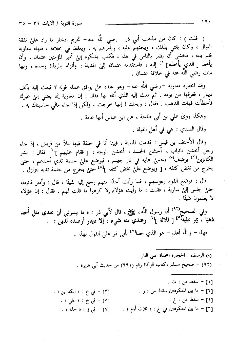 قُلْت " كَانَ مِنْ مَذْهَب أَبِي ذَرّ رَضِيَ اللَّه عَنْهُ تَحْرِيم اِدِّخَار مَا زَادَ عَلَى نَفَقَة الْعِيَال وَكَانَ يُفْتِي بِذَلِكَ وَيَحُثّهُمْ عَلَيْهِ وَيَأْمُرهُمْ بِهِ وَيُغْلِظ فِي خِلَافه فَنَهَاهُ مُعَاوِيَة فَلَمْ يَنْتَهِ فَخَشِيَ أَنْ يَضُرّ بِالنَّاسِ فِي هَذَا فَكَتَبَ يَشْكُوهُ إِلَى أَمِير الْمُؤْمِنِينَ عُثْمَان وَأَنْ يَأْخُذهُ إِلَيْهِ فَاسْتَقْدَمَهُ عُثْمَان إِلَى الْمَدِينَة وَأَنْزَلَهُ بِالرَّبَذَة وَحْده وَبِهَا مَاتَ رَضِيَ اللَّه عَنْهُ فِي خِلَافَة عُثْمَان وَقَدْ اِخْتَبَرَهُ مُعَاوِيَة رَضِيَ اللَّه عَنْهُ وَهُوَ عِنْده هَلْ يُوَافِق عَمَله قَوْله فَبَعَثَ إِلَيْهِ بِأَلْفِ دِينَار فَفَرَّقَهَا مِنْ يَوْمه ثُمَّ بَعَثَ إِلَيْهِ الَّذِي أَتَاهُ بِهَا فَقَالَ إنَّ مُعَاوِيَة إِنَّمَا بَعَثَنِي إِلَى غَيْرك فَأَخْطَأْت فَهَاتِ الذَّهَب فَقَالَ وَيْحك إِنَّهَا خَرَجَتْ وَلَكِنْ إِذَا جَاءَ مَالِي حَاسَبْنَاك بِهِ وَهَكَذَا رَوَى عَلِيّ بْن أَبِي طَلْحَة عَنْ اِبْن عَبَّاس أَنَّهَا عَامَّة وَقَالَ السُّدِّيّ هِيَ فِي أَهْل الْقِبْلَة وَقَالَ الْأَحْنَف بْن قَيْس قَدِمْت الْمَدِينَة فَبَيْنَمَا أَنَا فِي حَلْقَة فِيهَا مَلَأ مِنْ قُرَيْش إِذْ جَاءَ رَجُل أَخْشَن الثِّيَاب أَخْشَن الْجَسَد أَخْشَن الْوَجْه فَقَامَ عَلَيْهِمْ فَقَالَ : بَشِّرْ الْكَنَّازِينَ بِرَضْفٍ يُحْمَى عَلَيْهِ فِي نَار جَهَنَّم فَيُوضَع عَلَى حَلَمَة ثَدْي أَحَدهمْ حَتَّى يَخْرُج مِنْ نُغْضِ كَتِفه وَيُوضَع عَلَى نُغْضِ كَتِفه حَتَّى يَخْرُج مِنْ حَلَمَة ثَدْيه يَتَزَلْزَل قَالَ فَوَضَعَ الْقَوْم رُءُوسهمْ فَمَا رَأَيْت أَحَدًا مِنْهُمْ رَجَعَ إِلَيْهِ شَيْئًا قَالَ فَأَدْبَرَ فَاتَّبَعْته حَتَّى جَلَسَ إِلَى سَارِيَة فَقُلْت مَا رَأَيْت هَؤُلَاءِ إِلَّا كَرِهُوا مَا قُلْت لَهُمْ فَقَالَ إِنَّ هَؤُلَاءِ لَا يَعْلَمُونَ شَيْئًا .