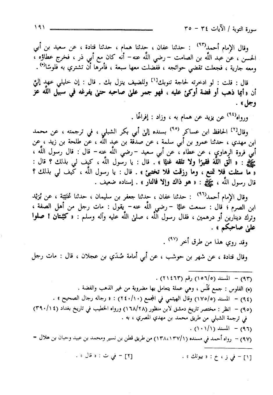 وَقَالَ الْحَافِظ اِبْن عَسَاكِر بِسَنَدِهِ إِلَى أَبِي بَكْر الشِّبْلِيّ فِي تَرْجَمَته عَنْ مُحَمَّد بْن مَهْدِيّ : حَدَّثَنَا عَمْرو بْن أَبِي سَلَمَة عَنْ صَدَقَة بْن عَبْد اللَّه عَنْ طَلْحَة بْن زَيْد عَنْ أَبِي فَرْوَة الرَّهَاوِيّ عَنْ عَطَاء عَنْ أَبِي سَعِيد رَضِيَ اللَّه عَنْهُ قَالَ : قَالَ رَسُول اللَّه صَلَّى اللَّه عَلَيْهِ وَسَلَّمَ اِلْقَ اللَّه فَقِيرًا وَلَا تَلْقَهُ غَنِيًّا " قَالَ : يَا رَسُول اللَّه كَيْف لِي بِذَلِكَ ؟ قَالَ " مَا سَأَلْت فَلَا تَمْنَع وَمَا رُزِقْت فَلَا تُخَبِّئ " قَالَ : يَا رَسُول اللَّه كَيْف لِي بِذَلِكَ ؟ قَالَ رَسُول اللَّه صَلَّى اللَّه عَلَيْهِ وَسَلَّمَ هُوَ ذَاكَ وَإِلَّا فَالنَّار " إِسْنَاده ضَعِيف وَقَالَ الْإِمَام أَحْمَد : حَدَّثَنَا عَفَّان حَدَّثَنَا جَعْفَر بْن سُلَيْمَان حَدَّثَنَا عُيَيْنَة عَنْ يَزِيد بْن الصِّرْم قَالَ : سَمِعْت عَلِيًّا رَضِيَ اللَّه عَنْهُ يَقُول : مَاتَ رَجُل مِنْ أَهْل الصُّفَّة وَتَرَكَ دِينَارَيْنِ أَوْ دِرْهَمَيْنِ فَقَالَ رَسُول اللَّه صَلَّى اللَّه عَلَيْهِ وَآلِهِ وَسَلَّمَ " كَيَّتَانِ صَلُّوا عَلَى صَاحِبكُمْ " وَقَدْ رُوِيَ هَذَا مِنْ طُرُق أُخَر وَقَالَ قَتَادَة عَنْ شَهْر بْن حَوْشَب عَنْ أَبِي أُمَامَة صُدَيّ بْن عَجْلَان قَالَ مَاتَ رَجُل