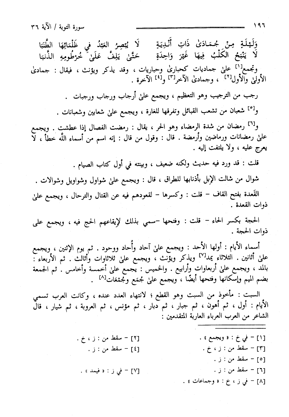 الْقَعْدَة بِفَتْحِ الْقَاف - قُلْت وَكَسْرهَا - لِقُعُودِهِمْ فِيهِ عَنْ الْقِتَال وَالتَّرْحَال وَيُجْمَع عَلَى ذَوَات الْقَعْدَة الْحِجَّة بِكَسْرِ الْحَاء - قُلْت وَفَتْحهَا - سُمِّيَ بِذَلِكَ لِإِيقَاعِهِمْ الْحَجّ فِيهِ وَيُجْمَع عَلَى ذَوَات الْحِجَّة أَسْمَاء الْأَيَّام أَوَّلهَا الْأَحَد وَيُجْمَع عَلَى آحَاد وَأَوْحَاد وَوُحُود ثُمَّ يَوْم الِاثْنَيْن وَيُجْمَع عَلَى أَثَانِينَ الثُّلَاثَاء يُمَدّ وَيُذَكَّر وَيُؤَنَّث وَيُجْمَع عَلَى ثَلَاثَاوَات وَأَثَالِث ثُمَّ الْأَرْبِعَاء بِالْمَدِّ وَيُجْمَع عَلَى أَرْبِعَاوَات وَأَرَابِيع وَالْخَمِيس يُجْمَع عَلَى أَخْمِسَة وَأَخَامِس ثُمَّ الْجُمُعَة بِضَمِّ الْمِيم وَإِسْكَانهَا وَفَتْحهَا أَيْضًا وَيُجْمَع عَلَى جُمَع وَجُمَاعَات .