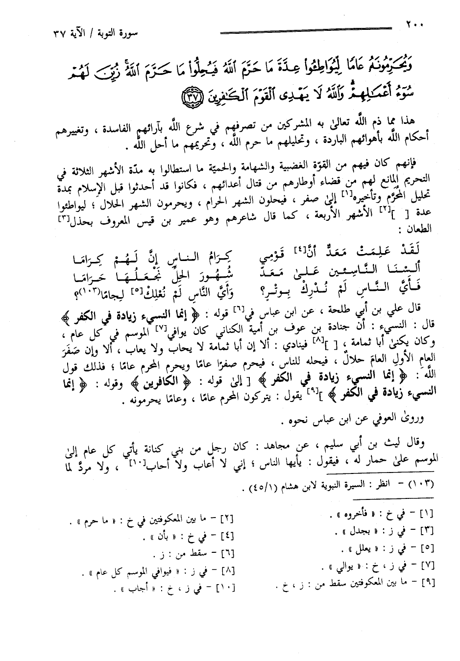 هَذَا مِمَّا ذَمَّ اللَّه تَعَالَى بِهِ الْمُشْرِكِينَ مِنْ تَصَرُّفهمْ فِي شَرْع اللَّه بِآرَائِهِمْ الْفَاسِدَة وَتَغْيِيرهمْ أَحْكَام اللَّه بِأَهْوَائِهِمْ الْبَارِدَة وَتَحْلِيلهمْ مَا حَرَّمَ اللَّه وَتَحْرِيمهمْ مَا أَحَلَّ اللَّه فَإِنَّهُمْ كَانَ فِيهِمْ مِنْ الْقُوَّة الْغَضَبِيَّة وَالشَّهَامِيَّة مَا اِسْتَطَاعُوا بِهِ مُدَّة الْأَشْهُر الثَّلَاثَة فِي التَّحْرِيم الْمَانِع لَهُمْ مِنْ قَضَاء أَوْطَارهمْ مِنْ قِتَال أَعْدَائِهِمْ فَكَانُوا قَدْ أَحْدَثُوا قَبْل الْإِسْلَام بِمُدَّةٍ تَحْلِيل الْمُحَرَّم فَأَخَّرُوهُ إِلَى صَفَر فَيُحِلُّونَ الشَّهْر الْحَرَام وَيُحَرِّمُونَ الشَّهْر الْحَلَال لِيُوَاطِئُوا عِدَّة مَا حَرَّمَ اللَّه الْأَشْهُر الْأَرْبَعَة كَمَا قَالَ شَاعِرهمْ وَهُوَ عُمَيْر بْن قَيْس الْمَعْرُوف بِجِذْلِ الطِّعَان :