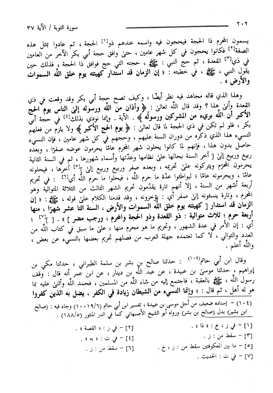 يُسَمُّونَ الْمُحَرَّم ذَا الْحَجَّة فَيَحُجُّونَ فِيهِ وَاسْمه عِنْدهمْ ذُو الْحَجَّة ثُمَّ عَادُوا بِمِثْلِ هَذِهِ الصِّفَة فَكَانُوا يَحُجُّونَ فِي كُلّ شَهْر عَامَيْنِ حَتَّى إِذَا وَافَقَ حَجَّة أَبِي بَكْر الْآخِر مِنْ الْعَامَيْنِ فِي ذِي الْقَعْدَة ثُمَّ حَجَّ النَّبِيّ صَلَّى اللَّه عَلَيْهِ وَسَلَّمَ حَجَّته الَّتِي حَجَّ فَوَافَقَ ذَا الْحَجَّة فَذَلِكَ حِين يَقُول النَّبِيّ صَلَّى اللَّه عَلَيْهِ وَسَلَّمَ فِي خُطْبَته " إِنَّ الزَّمَان قَدْ اِسْتَدَارَ كَهَيْئَتِهِ يَوْم خَلَقَ اللَّه السَّمَاوَات وَالْأَرْض " وَهَذَا الَّذِي قَالَهُ مُجَاهِد فِيهِ نَظَر أَيْضًا وَكَيْف تَصِحّ حَجَّة أَبِي بَكْر وَقَدْ وَقَعَتْ فِي ذِي الْقَعْدَة وَأَنَّى هَذَا ؟ وَقَدْ قَالَ اللَّه تَعَالَى " وَأَذَان مِنْ اللَّه وَرَسُوله إِلَى النَّاس يَوْم الْحَجّ الْأَكْبَر أَنَّ اللَّه بَرِيء مِنْ الْمُشْرِكِينَ وَرَسُوله " الْآيَة وَإِنَّمَا نُودِيَ بِهِ فِي حَجَّة أَبِي بَكْر فَلَوْ لَمْ تَكُنْ فِي ذِي الْحَجَّة لَمَا قَالَ تَعَالَى " يَوْم الْحَجّ الْأَكْبَر " وَلَا يَلْزَم مِنْ فِعْلهمْ النَّسِيء هَذَا الَّذِي ذَكَرَهُ مِنْ دَوَرَان السَّنَة عَلَيْهِمْ وَحَجّهمْ فِي كُلّ شَهْر عَامَيْنِ فَإِنَّ النَّسِيء حَاصِل بِدُونِ هَذَا فَإِنَّهُمْ لَمَّا كَانُوا يُحِلُّونَ شَهْر الْمُحَرَّم عَامًا يُحَرِّمُونَ عِوَضه صَفَرًا وَبَعْده رَبِيع وَرَبِيع إِلَى آخِر السَّنَة بِحَالِهَا عَلَى نِظَامهَا وَعِدَّتهَا وَأَسْمَاء شُهُورهَا ثُمَّ فِي السَّنَة الثَّانِيَة يُحَرِّمُونَ