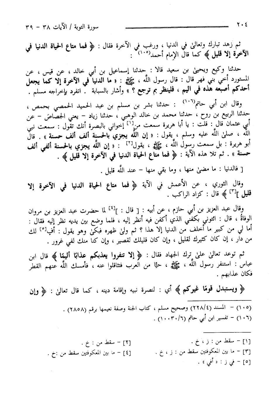 ثُمَّ تَوَعَّدَ تَعَالَى مَنْ تَرَكَ الْجِهَاد فَقَالَ " إِلَّا تَنْفِرُوا يُعَذِّبكُمْ عَذَابًا أَلِيمًا " قَالَ اِبْن عَبَّاس : اِسْتَنْفَرَ رَسُول اللَّه صَلَّى اللَّه عَلَيْهِ وَسَلَّمَ حَيًّا مِنْ الْعَرَب فَتَثَاقَلُوا عَنْهُ فَأَمْسَكَ اللَّه عَنْهُمْ الْقَطْر فَكَانَ عَذَابهمْ " وَيَسْتَبْدِل قَوْمًا غَيْركُمْ " أَيْ لِنُصْرَةِ نَبِيّه وَإِقَامَة دِينه كَمَا قَالَ تَعَالَى " وَإِنْ