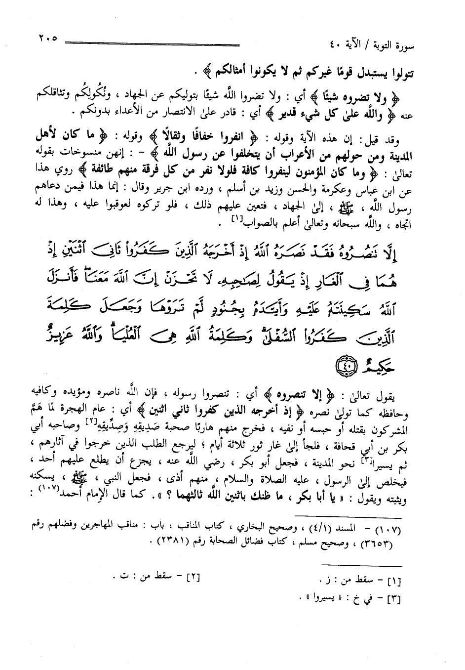 إِلَّا تَنْصُرُوهُ فَقَدْ نَصَرَهُ اللَّهُ إِذْ أَخْرَجَهُ الَّذِينَ كَفَرُوا ثَانِيَ اثْنَيْنِ إِذْ هُمَا فِي الْغَارِ إِذْ يَقُولُ لِصَاحِبِهِ لَا تَحْزَنْ إِنَّ اللَّهَ مَعَنَا فَأَنْزَلَ اللَّهُ سَكِينَتَهُ عَلَيْهِ وَأَيَّدَهُ بِجُنُودٍ لَمْ تَرَوْهَا وَجَعَلَ كَلِمَةَ الَّذِينَ كَفَرُوا السُّفْلَى وَكَلِمَةُ اللَّهِ هِيَ الْعُلْيَا وَاللَّهُ عَزِيزٌ حَكِيمٌ
