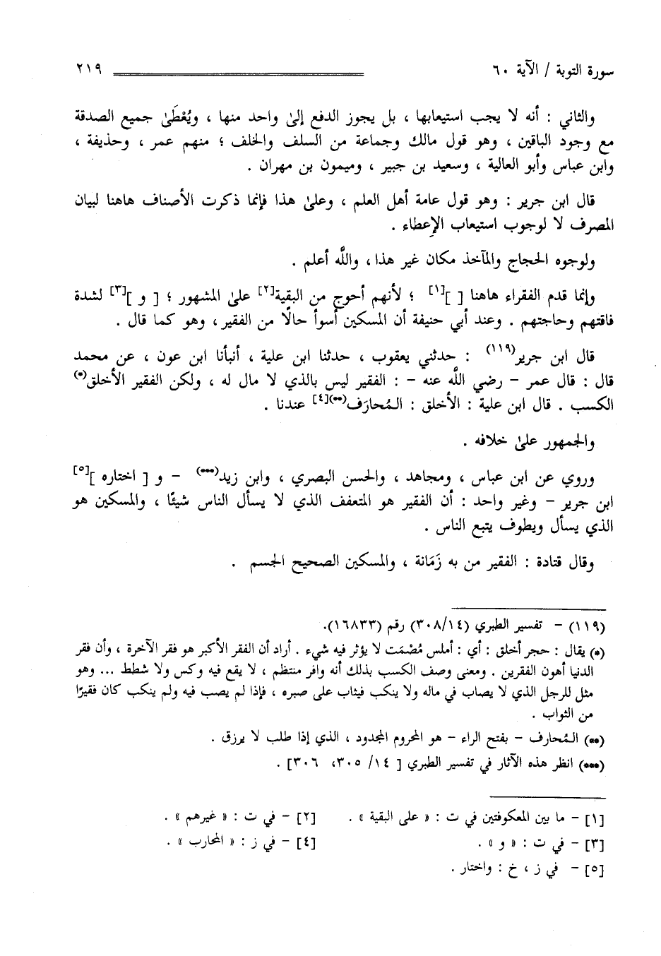 وَإِنَّمَا قَدَّمَ الْفُقَرَاء هَهُنَا عَلَى الْبَقِيَّة لِأَنَّهُمْ أَحْوَج مِنْ غَيْرهمْ عَلَى الْمَشْهُور وَلِشِدَّةِ فَاقَتهمْ وَحَاجَتهمْ وَعَنْ أَبِي حَنِيفَة أَنَّ الْمِسْكِين أَسْوَأ حَالًا مِنْ الْفَقِير وَهُوَ كَمَا قَالَ أَحْمَد وَقَالَ اِبْن جَرِير : حَدَّثَنِي يَعْقُوب حَدَّثَنَا اِبْن عُلَيَّة أَنْبَأَنَا اِبْن عَوْن عَنْ مُحَمَّد قَالَ : قَالَ عُمَر رَضِيَ اللَّه عَنْهُ الْفَقِير لَيْسَ بِاَلَّذِي لَا مَال لَهُ وَلَكِنَّ الْفَقِير الْأَخْلَق الْكَسْب قَالَ اِبْن عُلَيَّة الْأَخْلَق الْمُحَارَف عِنْدنَا وَالْجُمْهُور عَلَى خِلَافه وَرُوِيَ عَنْ اِبْن عَبَّاس وَمُجَاهِد وَالْحَسَن الْبَصْرِيّ وَابْن زَيْد وَاخْتَارَ اِبْن جَرِير وَغَيْر وَاحِد أَنَّ الْفَقِير هُوَ الْمُتَعَفِّف الَّذِي لَا يَسْأَل النَّاس شَيْئًا وَالْمِسْكِين هُوَ الَّذِي يَسْأَل وَيَطُوف وَيَتْبَع النَّاس وَقَالَ قَتَادَة الْفَقِير مَنْ بِهِ زَمَانَة وَالْمِسْكِين الصَّحِيح الْجِسْم