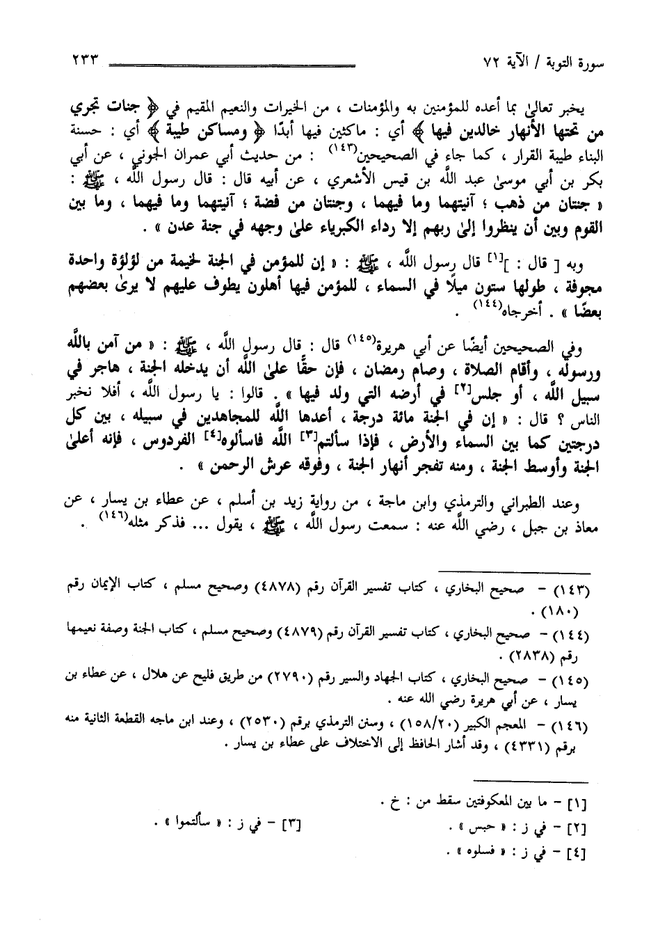 يُخْبِر تَعَالَى بِمَا أَعَدَّهُ لِلْمُؤْمِنِينَ بِهِ وَالْمُؤْمِنَات مِنْ الْخَيْرَات وَالنَّعِيم الْمُقِيم فِي " جَنَّات تَجْرِي مِنْ تَحْتهَا الْأَنْهَار خَالِدِينَ فِيهَا " أَيْ مَاكِثِينَ فِيهَا أَبَدًا " وَمَسَاكِن طَيِّبَة " أَيْ حَسَنَة الْبِنَاء طَيِّبَة الْقَرَار كَمَا جَاءَ فِي الصَّحِيحَيْنِ مِنْ حَدِيث أَبِي عِمْرَان الْجَوْنِيّ عَنْ أَبِي بَكْر بْن أَبِي مُوسَى عَبْد اللَّه بْن قَيْس الْأَشْعَرِيّ عَنْ أَبِيهِ قَالَ : قَالَ رَسُول اللَّه صَلَّى اللَّه عَلَيْهِ وَسَلَّمَ جَنَّتَانِ مِنْ ذَهَب آنِيَتهمَا وَمَا فِيهِمَا وَجَنَّتَانِ مِنْ فِضَّة وَآنِيَتهمَا وَمَا فِيهِمَا وَمَا بَيْن الْقَوْم وَبَيْن أَنْ يَنْظُرُوا إِلَى رَبّهمْ إِلَّا رِدَاء الْكِبْرِيَاء عَلَى وَجْهه فِي جَنَّة عَدْن وَبِهِ قَالَ : قَالَ رَسُول اللَّه صَلَّى اللَّه عَلَيْهِ وَسَلَّمَ إِنَّ لِلْمُؤْمِنِ فِي الْجَنَّة لَخَيْمَة مِنْ لُؤْلُؤَة وَاحِدَة مُجَوَّفَة طُولهَا سِتُّونَ مِيلًا فِي السَّمَاء لِلْمُؤْمِنِ فِيهَا أَهْلُونَ يَطُوف عَلَيْهِمْ لَا يَرَى بَعْضهمْ بَعْضًا أَخْرَجَاهُ فِي الصَّحِيحَيْنِ وَفِيهِمَا أَيْضًا عَنْ أَبِي هُرَيْرَة قَالَ : قَالَ رَسُول اللَّه صَلَّى اللَّه عَلَيْهِ وَسَلَّمَ مَنْ آمَنَ بِاَللَّهِ وَرَسُوله وَأَقَامَ الصَّلَاة وَصَامَ رَمَضَان فَإِنَّ حَقًّا عَلَى اللَّه أَنْ يُدْخِلهُ الْجَنَّة هَاجَرَ فِي سَبِيل اللَّه أَوْ جَلَسَ فِي أَرْضه الَّتِي وُلِدَ فِيهَا قَالُوا يَا رَسُول اللَّه أَفَلَا نُخْبِر النَّاس ؟ قَالَ إِنَّ فِي الْجَنَّة مِائَة دَرَجَة أَعَدَّهَا اللَّه لِلْمُجَاهِدِينَ فِي سَبِيله بَيْن كُلّ دَرَجَتَيْنِ كَمَا بَيْن السَّمَاء وَالْأَرْض فَإِذَا سَأَلْتُمْ اللَّه فَاسْأَلُوهُ الْفِرْدَوْس فَإِنَّهُ أَعْلَى الْجَنَّة وَأَوْسَط الْجَنَّة وَمِنْهُ تَفَجَّر أَنْهَار الْجَنَّة وَفَوْقه عَرْش الرَّحْمَن وَعِنْد الطَّبَرَانِيّ وَالتِّرْمِذِيّ وَابْن مَاجَهْ مِنْ رِوَايَة زَيْد بْن أَسْلَم عَنْ عَطَاء عَنْ يَسَار عَنْ مُعَاذ بْن جَبَل رَضِيَ اللَّه عَنْهُ سَمِعْت رَسُول اللَّه صَلَّى اللَّه عَلَيْهِ وَسَلَّمَ يَقُول فَذَكَرَ مِثْله