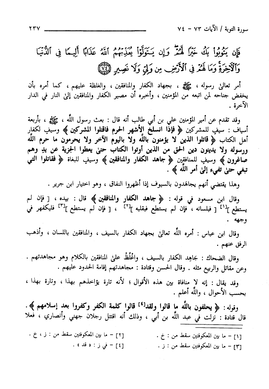 يَحْلِفُونَ بِاللَّهِ مَا قَالُوا وَلَقَدْ قَالُوا كَلِمَةَ الْكُفْرِ وَكَفَرُوا بَعْدَ إِسْلَامِهِمْ وَهَمُّوا بِمَا لَمْ يَنَالُوا وَمَا نَقَمُوا إِلَّا أَنْ أَغْنَاهُمُ اللَّهُ وَرَسُولُهُ مِنْ فَضْلِهِ فَإِنْ يَتُوبُوا يَكُ خَيْرًا لَهُمْ وَإِنْ يَتَوَلَّوْا يُعَذِّبْهُمُ اللَّهُ عَذَابًا أَلِيمًا فِي الدُّنْيَا وَالْآَخِرَةِ وَمَا لَهُمْ فِي الْأَرْضِ مِنْ وَلِيٍّ وَلَا نَصِيرٍ (74)