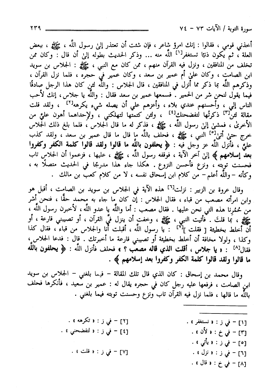 وَقَالَ مُحَمَّد بْن إسْحَاق كَانَ الَّذِي قَالَ تِلْكَ الْمَقَالَة فِيمَا بَلَغَنِي الْجَلَّاس بْن سُوَيْد بْن الصَّامِت فَرَفَعَهَا عَلَيْهِ رَجُل كَانَ فِي حِجْره يُقَال لَهُ عُمَيْر بْن سَعْد فَأَنْكَرَهَا فَحَلَفَ بِاَللَّهِ مَا قَالَهَا فَلَمَّا نَزَلَ فِيهِ الْقُرْآن تَابَ وَنَزَعَ وَحَسُنَتْ تَوْبَته فِيمَا بَلَغَنِي