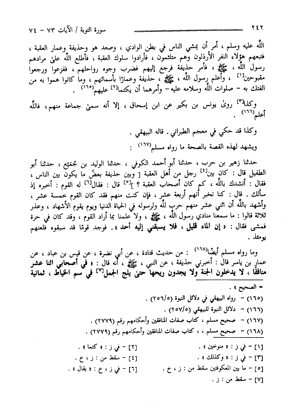 وَكَذَا قَدْ حُكِيَ فِي مُعْجَم الطَّبَرَانِيّ قَالَهُ الْبَيْهَقِيّ وَيَشْهَد لِهَذِهِ الْقِصَّة بِالصِّحَّةِ مَا رَوَاهُ مُسْلِم حَدَّثَنَا زُهَيْر بْن حَرْب حَدَّثَنَا أَبُو أَحْمَد الْكُوفِيّ حَدَّثَنَا الْوَلِيد بْن جُمَيْع حَدَّثَنَا أَبُو الطُّفَيْل قَالَ : كَانَ بَيْن رَجُل مِنْ أَهْل الْعَقَبَة وَبَيْن حُذَيْفَة بَعْض مَا يَكُون بَيْن النَّاس فَقَالَ أَنْشُدكُمْ بِاَللَّهِ كَمْ كَانَ أَصْحَاب الْعَقَبَة ؟ قَالَ : فَقَالَ لَهُ الْقَوْم أَخْبِرهُ إِذْ سَأَلَك فَقَالَ كُنَّا نُخْبَر أَنَّهُمْ أَرْبَعَة عَشَر فَإِنْ كُنْتَ مِنْهُمْ فَقَدْ كَانَ الْقَوْم خَمْسَة عَشَر وَأَشْهَد بِاَللَّهِ أَنَّ اِثْنَيْ عَشَر مِنْهُمْ حَرْب لِلَّهِ وَلِرَسُولِهِ فِي الْحَيَاة الدُّنْيَا وَيَوْم يَقُوم الْأَشْهَاد وَعَذَرَ ثَلَاثَة قَالُوا مَا سَمِعْنَا مُنَادِي رَسُول اللَّه صَلَّى اللَّه عَلَيْهِ وَسَلَّمَ وَلَا عَلِمْنَا بِمَا أَرَادَ الْقَوْم وَقَدْ كَانَ فِي حَرَّة يَمْشِي فَقَالَ " إِنَّ الْمَاء قَلِيل فَلَا يَسْبِقنِي إِلَيْهِ أَحَد " فَوَجَدَ قَوْمًا قَدْ سَبَقُوهُ فَلَعَنَهُمْ يَوْمئِذٍ وَمَا رَوَاهُ مُسْلِم أَيْضًا مِنْ حَدِيث قَتَادَة عَنْ أَبِي نَضْرَة عَنْ قَيْس بْن عَبَّاد عَنْ عَمَّار بْن يَاسِر قَالَ : أَخْبَرَنِي حُذَيْفَة عَنْ النَّبِيّ صَلَّى اللَّه عَلَيْهِ وَسَلَّمَ أَنَّهُ قَالَ " فِي أَصْحَابِي اِثْنَا عَشَر مُنَافِقًا لَا يَدْخُلُونَ الْجَنَّة وَلَا يَجِدُونَ رِيحهَا حَتَّى يَلِج الْجَمَل فِي سَمِّ الْخِيَاط : ثَمَانِيَة