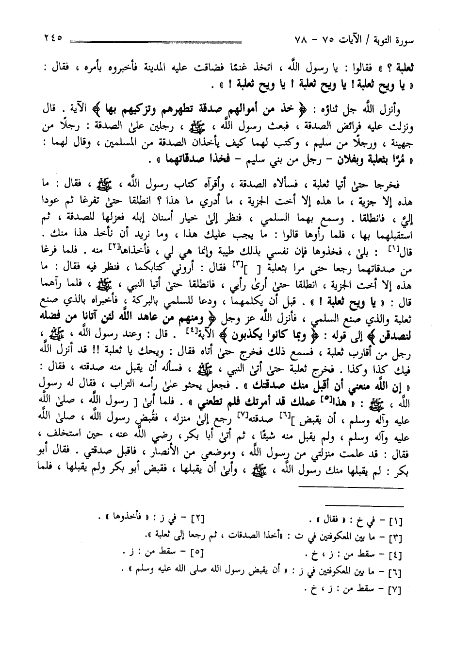 وَنَزَلَتْ فَرَائِض الصَّدَقَة فَبَعَثَ رَسُول اللَّه صَلَّى اللَّه عَلَيْهِ وَسَلَّمَ رَجُلَيْنِ عَلَى الصَّدَقَة مِنْ الْمُسْلِمِينَ رَجُلًا مِنْ جُهَيْنَة وَرَجُلًا مِنْ سُلَيْم وَكَتَبَ لَهُمَا كَيْف يَأْخُذَانِ الصَّدَقَة مِنْ الْمُسْلِمِينَ وَقَالَ لَهُمَا مُرَّا بِثَعْلَبَة وَبِفُلَانٍ رَجُل مِنْ بَنِي سُلَيْم فَخُذَا صَدَقَاتهمَا فَخَرَجَا حَتَّى أَتَيَا ثَعْلَبَة فَسَأَلَاهُ الصَّدَقَة وَأَقْرَآهُ كِتَاب رَسُول اللَّه صَلَّى اللَّه عَلَيْهِ وَسَلَّمَ فَقَالَ : مَا هَذِهِ إِلَّا جِزْيَة مَا هَذِهِ إِلَّا أُخْت الْجِزْيَة مَا أَدْرِي مَا هَذَا ؟ اِنْطَلِقَا حَتَّى تَفْرُغَا ثُمَّ عُودَا إِلَيَّ فَانْطَلَقَا وَسَمِعَ بِهِمَا السُّلَمِيّ فَنَظَرَ إِلَى خِيَار أَسْنَان إِبِله فَعَزَلَهَا لِلصَّدَقَةِ ثُمَّ اِسْتَقْبَلَهُمَا بِهَا فَلَمَّا رَأَوْهَا قَالُوا مَا يَجِب عَلَيْك هَذَا وَمَا نُرِيد أَنْ نَأْخُذ هَذَا مِنْك فَقَالَ بَلَى فَخُذُوهَا فَإِنَّ نَفْسِي بِذَلِكَ طَيِّبَة وَإِنَّمَا هِيَ لَهُ فَأَخَذَاهَا مِنْهُ وَمَرَّا عَلَى النَّاس فَأَخَذَا الصَّدَقَات ثُمَّ رَجَعَا إِلَى ثَعْلَبَة فَقَالَ : أَرُونِي كِتَابكُمَا فَقَرَأَهُ فَقَالَ مَا هَذِهِ إِلَّا جِزْيَة مَا هَذِهِ إِلَّا أُخْت الْجِزْيَة اِنْطَلِقَا حَتَّى أَرَى رَأْيِي فَانْطَلَقَا حَتَّى أَتَيَا النَّبِيّ صَلَّى اللَّه عَلَيْهِ وَسَلَّمَ فَلَمَّا رَآهُمَا قَالَ يَا وَيْح ثَعْلَبَة قَبْل أَنْ يُكَلِّمهُمَا وَدَعَا لِلسُّلَمِيّ بِالْبَرَكَةِ فَأَخْبَرَاهُ بِاَلَّذِي صَنَعَ ثَعْلَبَة وَاَلَّذِي صَنَعَ السُّلَمِيّ فَأَنْزَلَ اللَّه عَزَّ وَجَلَّ " وَمِنْهُمْ مَنْ عَاهَدَ اللَّه لَئِنْ آتَانَا مِنْ فَضْله لَنَصَّدَّقَنَّ " الْآيَة .