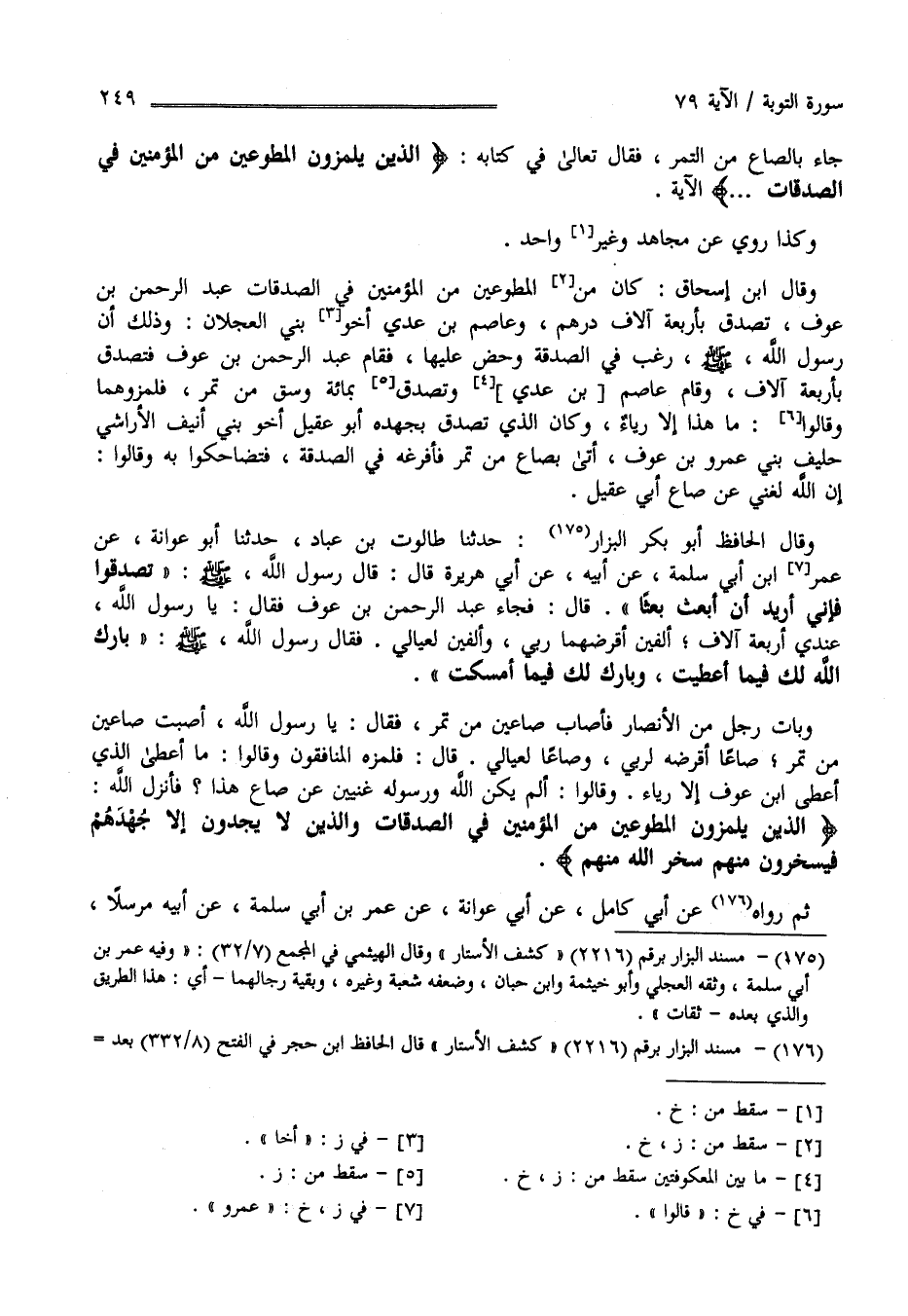 وَهَكَذَا رُوِيَ عَنْ مُجَاهِد وَغَيْر وَاحِد وَقَالَ اِبْن إسْحَاق كَانَ مِنْ الْمُطَّوِّعِينَ مِنْ الْمُؤْمِنِينَ فِي الصَّدَقَات عَبْد الرَّحْمَن بْن عَوْف تَصَدَّقَ بِأَرْبَعَةِ آلَاف دِرْهَم وَعَاصِم بْن عَدِيّ أَخُو بَنِي الْعَجْلَان وَذَلِكَ أَنَّ رَسُول اللَّه صَلَّى اللَّه عَلَيْهِ وَسَلَّمَ رَغَّبَ فِي الصَّدَقَة وَحَضَّ عَلَيْهَا فَقَامَ عَبْد الرَّحْمَن بْن عَوْف فَتَصَدَّقَ بِأَرْبَعَةِ آلَاف وَقَامَ عَاصِم بْن عَدِيّ وَتَصَدَّقَ بِمِائَةِ وَسْق مِنْ تَمْر فَلَمَزُوهُمَا وَقَالُوا مَا هَذَا إِلَّا رِيَاء وَكَانَ الَّذِي تَصَدَّقَ بِجُهْدِهِ أَبُو عُقَيْل أَخُو بَنِي أُنَيْف الْأَرَاشِيّ حَلِيف بْنِي عَمْرو بْن عَوْف أَتَى بِصَاعٍ مِنْ تَمْر فَأَفْرَغَهُ فِي الصَّدَقَة فَتَضَاحَكُوا بِهِ فَقَالُوا إِنَّ اللَّه لَغَنِيّ عَنْ صَاع أَبِي عُقَيْل وَقَالَ الْحَافِظ أَبُو بَكْر الْبَزَّار حَدَّثَنَا طَالُوت بْن عَبَّاد حَدَّثَنَا أَبُو عَوَانَة عَنْ عَمْرو بْن أَبِي سَلَمَة عَنْ أَبِيهِ عَنْ أَبِي هُرَيْرَة قَالَ : قَالَ رَسُول اللَّه صَلَّى اللَّه عَلَيْهِ وَسَلَّمَ تَصَدَّقُوا فَإِنِّي أُرِيد أَنْ أَبْعَث بَعْثًا قَالَ فَجَاءَ عَبْد الرَّحْمَن بْن عَوْف فَقَالَ يَا رَسُول اللَّه عِنْدِي أَرْبَعَة آلَاف أَلْفَيْنِ أُقْرِضهُمَا رَبِّي وَأَلْفَيْنِ لِعِيَالِي فَقَالَ رَسُول اللَّه صَلَّى اللَّه عَلَيْهِ وَسَلَّمَ بَارَكَ اللَّه فِيك فِيمَا أَعْطَيْت وَبَارَكَ لَك فِيمَا أَمْسَكْت وَبَاتَ رَجُل مِنْ الْأَنْصَار فَأَصَابَ صَاعَيْنِ مِنْ تَمْر فَقَالَ يَا رَسُول اللَّه أَصَبْت صَاعَيْنِ مِنْ تَمْر صَاع أُقْرِضهُ لِرَبِّي وَصَاع لِعِيَالِي قَالَ فَلَمَزَهُ الْمُنَافِقُونَ وَقَالُوا مَا أَعْطَى الَّذِي أَعْطَى اِبْن عَوْف إِلَّا رِيَاء وَقَالُوا أَلَمْ يَكُنْ اللَّه وَرَسُوله غَنِيَّيْنِ عَنْ صَاع هَذَا ؟ فَأَنْزَلَ اللَّه " الَّذِينَ يَلْمِزُونَ الْمُطَّوِّعِينَ مِنْ الْمُؤْمِنِينَ فِي الصَّدَقَات وَاَلَّذِينَ لَا يَجِدُونَ إِلَّا جُهْدهمْ فَيَسْخَرُونَ مِنْهُمْ " الْآيَة .