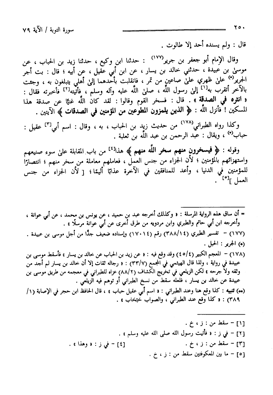 قَالَ قَالَ وَلَمْ يُسْنِدهُ أَحَد إِلَّا طَالُوت وَقَالَ الْإِمَام أَبُو جَعْفَر بْن جَرِير حَدَّثَنَا اِبْن وَكِيع حَدَّثَنَا زَيْد بْن الْحُبَاب عَنْ مُوسَى عَنْ عُبَيْد حَدَّثَنِي خَالِد بْن يَسَار عَنْ اِبْن أَبِي عُقَيْل عَنْ أَبِيهِ قَالَ بِتّ أَجُرّ الْجَرِير عَلَى ظَهْرِي عَلَى صَاعَيْنِ مِنْ تَمْر فَانْقَلَبْت بِأَحَدِهِمَا إِلَى أَهْلِي يَتَبَلَّغُونَ بِهِ وَجِئْت بِالْآخَرِ أَتَقَرَّب إِلَى رَسُول اللَّه صَلَّى اللَّه عَلَيْهِ وَآلِهِ وَسَلَّمَ فَأَتَيْته فَأَخْبَرْته فَقَالَ اُنْثُرْهُ فِي الصَّدَقَة قَالَ فَسَخِرَ الْقَوْم وَقَالُوا لَقَدْ كَانَ اللَّه غَنِيًّا عَنْ صَدَقَة هَذَا الْمِسْكِين فَأَنْزَلَ اللَّه الَّذِينَ يَلْمِزُونَ الْمُطَّوِّعِينَ .