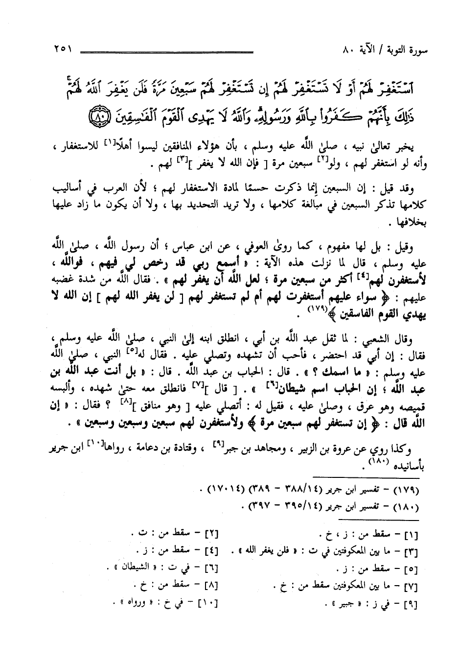 اسْتَغْفِرْ لَهُمْ أَوْ لَا تَسْتَغْفِرْ لَهُمْ إِنْ تَسْتَغْفِرْ لَهُمْ سَبْعِينَ مَرَّةً فَلَنْ يَغْفِرَ اللَّهُ لَهُمْ ذَلِكَ بِأَنَّهُمْ كَفَرُوا بِاللَّهِ وَرَسُولِهِ وَاللَّهُ لَا يَهْدِي الْقَوْمَ الْفَاسِقِينَ (80)
