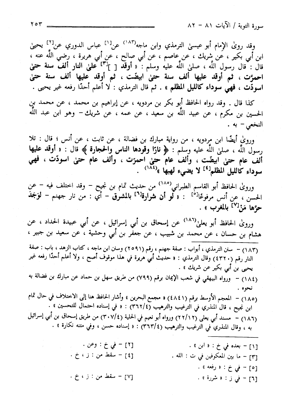 وَقَدْ رَوَى الْإِمَام أَبُو عِيسَى التِّرْمِذِيّ وَابْن مَاجَهْ عَنْ اِبْن عَبَّاس الدَّوْرِيّ وَعَنْ يَحْيَى بْن أَبِي بُكَيْر عَنْ شَرِيك عَنْ عَاصِم عَنْ أَبِي صَالِح عَنْ أَبِي هُرَيْرَة رَضِيَ اللَّه عَنْهُ قَالَ : قَالَ رَسُول اللَّه صَلَّى اللَّه عَلَيْهِ وَسَلَّمَ " أَوْقَدَ اللَّه عَلَى النَّار أَلْف سَنَة حَتَّى اِحْمَرَّتْ ثُمَّ أَوْقَدَ عَلَيْهَا أَلْف سَنَة حَتَّى اِبْيَضَّتْ ثُمَّ أَوْقَدَ عَلَيْهَا أَلْف سَنَة حَتَّى اِسْوَدَّتْ فَهِيَ سَوْدَاء كَاللَّيْلِ الْمُظْلِم " ثُمَّ قَالَ التِّرْمِذِيّ لَا أَعْلَم أَحَدًا رَفَعَهُ غَيْر يَحْيَى .
