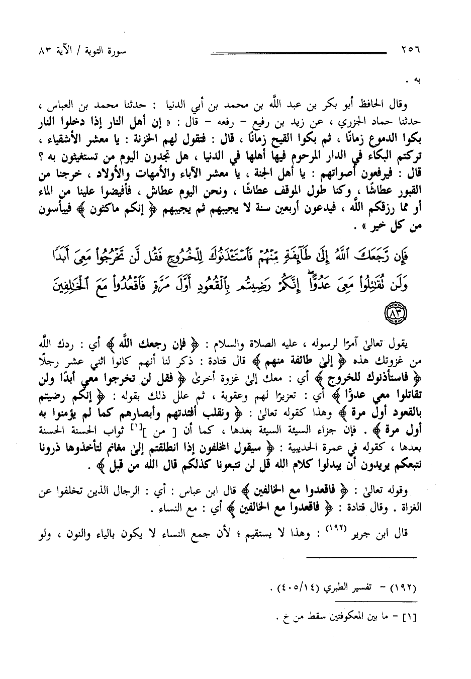فَإِنْ رَجَعَكَ اللَّهُ إِلَى طَائِفَةٍ مِنْهُمْ فَاسْتَأْذَنُوكَ لِلْخُرُوجِ فَقُلْ لَنْ تَخْرُجُوا مَعِيَ أَبَدًا وَلَنْ تُقَاتِلُوا مَعِيَ عَدُوًّا إِنَّكُمْ رَضِيتُمْ بِالْقُعُودِ أَوَّلَ مَرَّةٍ فَاقْعُدُوا مَعَ الْخَالِفِينَ (83)