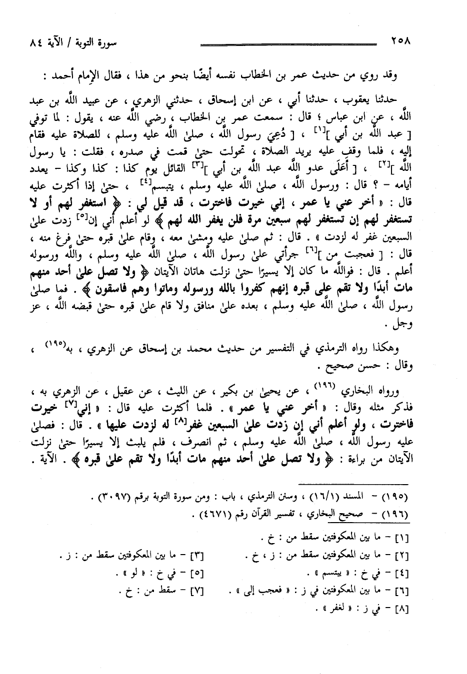 وَقَدْ رُوِيَ مِنْ حَدِيث عُمَر بْن الْخَطَّاب نَفْسه أَيْضًا بِنَحْوٍ مِنْ هَذَا فَقَالَ الْإِمَام أَحْمَد : حَدَّثَنَا يَعْقُوب حَدَّثَنَا أَبِي عَنْ اِبْن إِسْحَاق حَدَّثَنِي الزُّهْرِيّ عَنْ عُبَيْد اللَّه بْن عَبْد اللَّه عَنْ اِبْن عَبَّاس قَالَ سَمِعْت عُمَر بْن الْخَطَّاب رَضِيَ اللَّه عَنْهُ يَقُول : لَمَّا تُوُفِّيَ عَبْد اللَّه بْن أُبَيّ دُعِيَ رَسُول اللَّه صَلَّى اللَّه عَلَيْهِ وَسَلَّمَ لِلصَّلَاةِ عَلَيْهِ فَقَامَ إِلَيْهِ فَلَمَّا وَقَفَ عَلَيْهِ يُرِيد الصَّلَاة تَحَوَّلْت حَتَّى قُمْت فِي صَدْره فَقُلْت يَا رَسُول اللَّه أَعَلَى عَدُوّ اللَّه عَبْد اللَّه بْن أُبَيّ الْقَائِل يَوْم كَذَا وَكَذَا وَكَذَا - يُعَدِّد أَيَّامه - ؟ قَالَ وَرَسُول اللَّه صَلَّى اللَّه عَلَيْهِ وَسَلَّمَ يَتَبَسَّم حَتَّى إِذَا أَكْثَرْت عَلَيْهِ قَالَ " أَخِّرْ عَنِّي يَا عُمَر إِنِّي خُيِّرْت فَاخْتَرْت قَدْ قِيلَ لِي " اِسْتَغْفِرْ لَهُمْ " الْآيَة .
