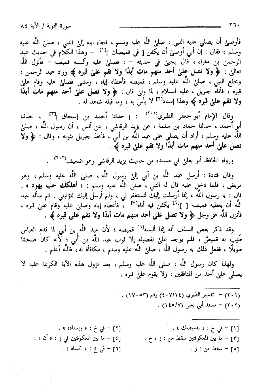 وَقَالَ الْإِمَام أَبُو جَعْفَر الطَّبَرِيّ حَدَّثَنَا أَحْمَد بْن إِسْحَاق حَدَّثَنَا أَبُو أَحْمَد حَدَّثَنَا حَمَّاد بْن سَلَمَة عَنْ يَزِيد الرَّقَاشِيّ عَنْ أَنَس أَنَّ رَسُول اللَّه صَلَّى اللَّه عَلَيْهِ وَسَلَّمَ أَرَادَ أَنْ يُصَلِّي عَلَى عَبْد اللَّه بْن أُبَيّ فَأَخَذَ جِبْرِيل بِثَوْبِهِ وَقَالَ وَلَا تُصَلِّ عَلَى أَحَد مِنْهُمْ مَاتَ أَبَدًا وَلَا تَقُمْ عَلَى قَبْره .