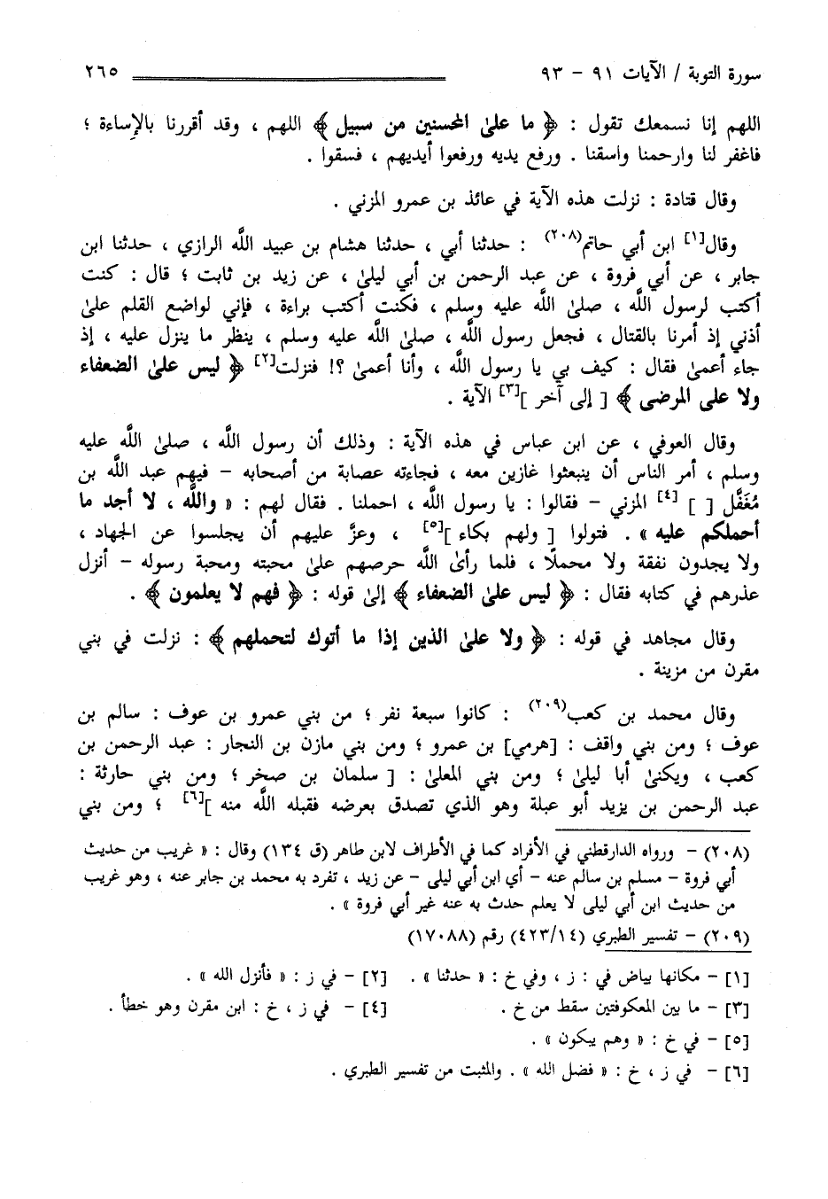 اللَّهُمَّ إنَّا نَسْمَعك تَقُول مَا عَلَى الْمُحْسِنِينَ مِنْ سَبِيل اللَّهُمَّ وَقَدْ أَقْرَرْنَا بِالْإِسَاءَةِ فَاغْفِرْ لَنَا وَارْحَمْنَا وَاسْقِنَا وَرَفَعَ يَدَيْهِ وَرَفَعُوا أَيْدِيهمْ فَسَقَوْا وَقَالَ قَتَادَة نَزَلَتْ هَذِهِ الْآيَة فِي عَائِذ بْن عَمْرو الْمُزَنِيّ حَدَّثَنَا اِبْن أَبِي حَاتِم حَدَّثَنَا أَبِي حَدَّثَنَا هِشَام بْن عُبَيْد اللَّه الرَّازِيّ حَدَّثَنَا اِبْن جَابِر عَنْ اِبْن فَرْوَة عَنْ عَبْد الرَّحْمَن بْن أَبِي لَيْلَى عَنْ زَيْد بْن ثَابِت قَالَ : كُنْت أَكْتُب لِرَسُولِ اللَّه صَلَّى اللَّه عَلَيْهِ وَسَلَّمَ فَكُنْت أَكْتُب بَرَاءَة فَإِنِّي لَوَاضِع الْقَلَم عَلَى أُذُنِي إِذْ أُمِرْنَا بِالْقِتَالِ فَجَعَلَ رَسُول اللَّه صَلَّى اللَّه عَلَيْهِ وَسَلَّمَ يَنْظُر مَا يَنْزِل عَلَيْهِ إِذَا جَاءَ أَعْمَى فَقَالَ كَيْف بِي يَا رَسُول اللَّه وَأَنَا أَعْمَى ؟ فَنَزَلَتْ لَيْسَ عَلَى الضُّعَفَاء .